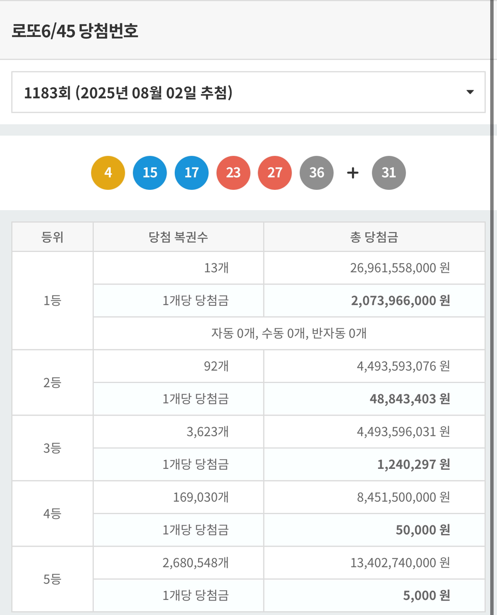 樂soccer 로또 1183회차 당첨번호. 1등 당첨금 20억7천만원 작성시간25.08.02|조회수7,853 목록 댓글 10 글자크기 작게가 글자크기 크게가 다음검색 현재 게시글 추가 기능 열기 북마크 공유하기 신고 센터로 신고 댓글 10 댓글 리스트 작성시간 25.08.02 1등 자동 수동 반자동 다 0개 무슨 말이지? 답댓글 작성시간 25.08.02 업데이트전 이미지 확대 답댓글 작성시간 25.08.02 오 글쿤요 작성시간 25.08.02 나다 작성시간 25.08.02 와 평소에 안 찍는 번호만 나왔네안 사길 잘함 카페 방문해 더 많은 댓글 만나기!