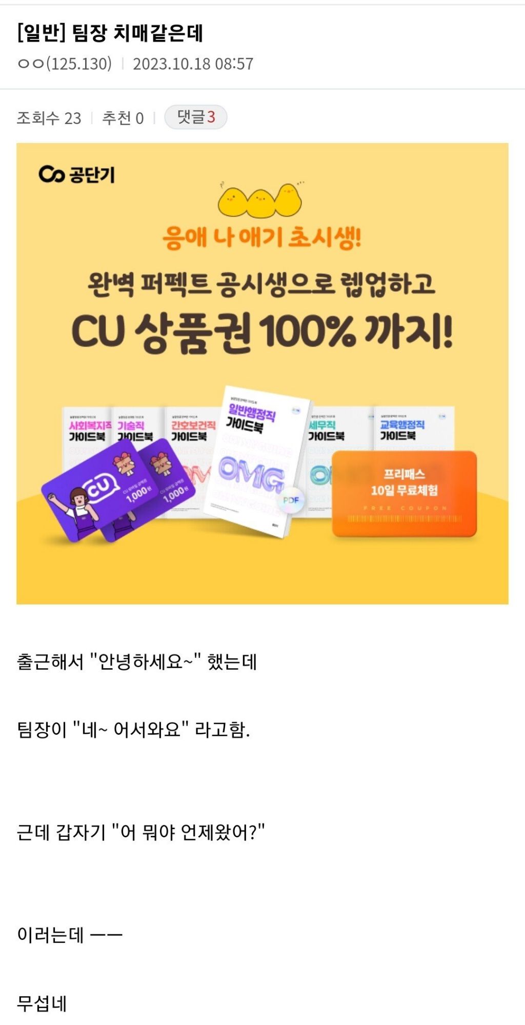 [기타]팀장이 치매 걸린것 같다는 디씨인 작성자음교수2|작성시간25.08.04|조회수1,264 목록 댓글 1 글자크기 작게가 글자크기 크게가 다음검색 현재 게시글 추가 기능 열기 북마크 공유하기 신고 센터로 신고 댓글 댓글 1 댓글쓰기 답글쓰기 댓글 리스트 작성자tnatropmI | 작성시간 25.08.04 ㅋㅋㅋ 댓글 전체보기