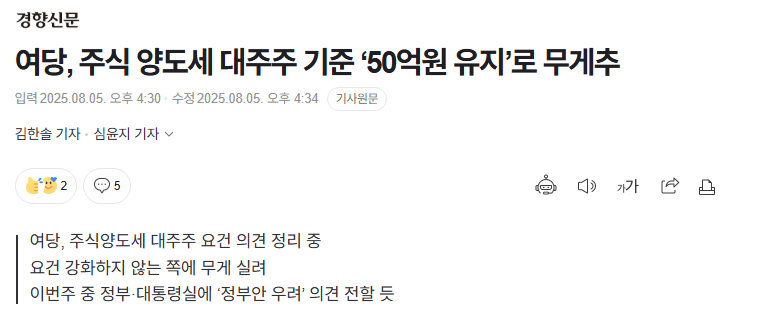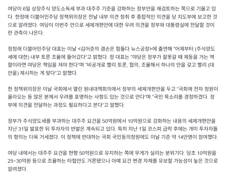 [기사]여당, 주식 양도세 대주주 기준 ‘50억원 유지’로 무게추 작성자존예보스황예지|작성시간25.08.05|조회수1,832 목록 댓글 28 글자크기 작게가 글자크기 크게가 https://n.news.naver.com/article/032/0003387572여당, 주식 양도세 대주주 기준 ‘50억원 유지’로 무게추여당이 5일 상장주식 양도소득세 부과 대주주 기준을 강화하는 정부안을 재검토하는 쪽으로 기울고 있다. 한정애 더불어민주당 정책위의장은 전날 내부 의견 청취 후 종합적인 의견을 당 지도n.news.naver.com 다음검색 현재 게시글 추가 기능 열기 북마크 공유하기 신고 센터로 신고 댓글 댓글 28 댓글쓰기 답글쓰기 댓글 리스트 답댓글 작성자요한코 | 작성시간 25.08.05 공감합니다 답댓글 작성자이라또 | 작성시간 25.08.05 그러게요부자가 죄인은 아닌데죄인처럼 대함....부자감세라고 쳐도그건 무조건 하면 안되는 일인가 작성자케빈데브라이너 | 작성시간 25.08.05 진성준은 빨리 꺼지고 아님 꺼짐당하길 작성자메리다 | 작성시간 25.08.05 그래도 지지하는 여론과 국민들이 화내면 눈치보고 바꾸긴 하네요 ㅋㅋㅋ과거 자칭 보수정권들이랑은 다름 ㅋ 작성자이나경 | 작성시간 25.08.05 댓글 전체보기