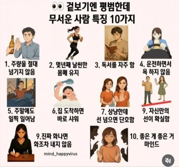 [정보]겉보기에는 평범한데 무서운 사람 특징 10가지 작성자맨유야 잘하자|작성시간25.08.11|조회수4,563 목록 댓글 7 글자크기 작게가 글자크기 크게가 다음검색 현재 게시글 추가 기능 열기 북마크 공유하기 신고 센터로 신고 댓글 댓글 7 댓글쓰기 답글쓰기 댓글 리스트 작성자산송장s | 작성시간 25.08.11 근데 딱히 좋은 성격이라기엔.. 작성자고구려 | 작성시간 25.08.11 밥먹자마자 설거지 작성자아메리카노 | 작성시간 25.08.11 ㄷㄷ 작성자tnatropmI | 작성시간 25.08.11 👍 작성자필승한국 | 작성시간 25.08.11 술.담배.커피.탄산 4개다 안하는 사람 조심하랬음. 댓글 전체보기