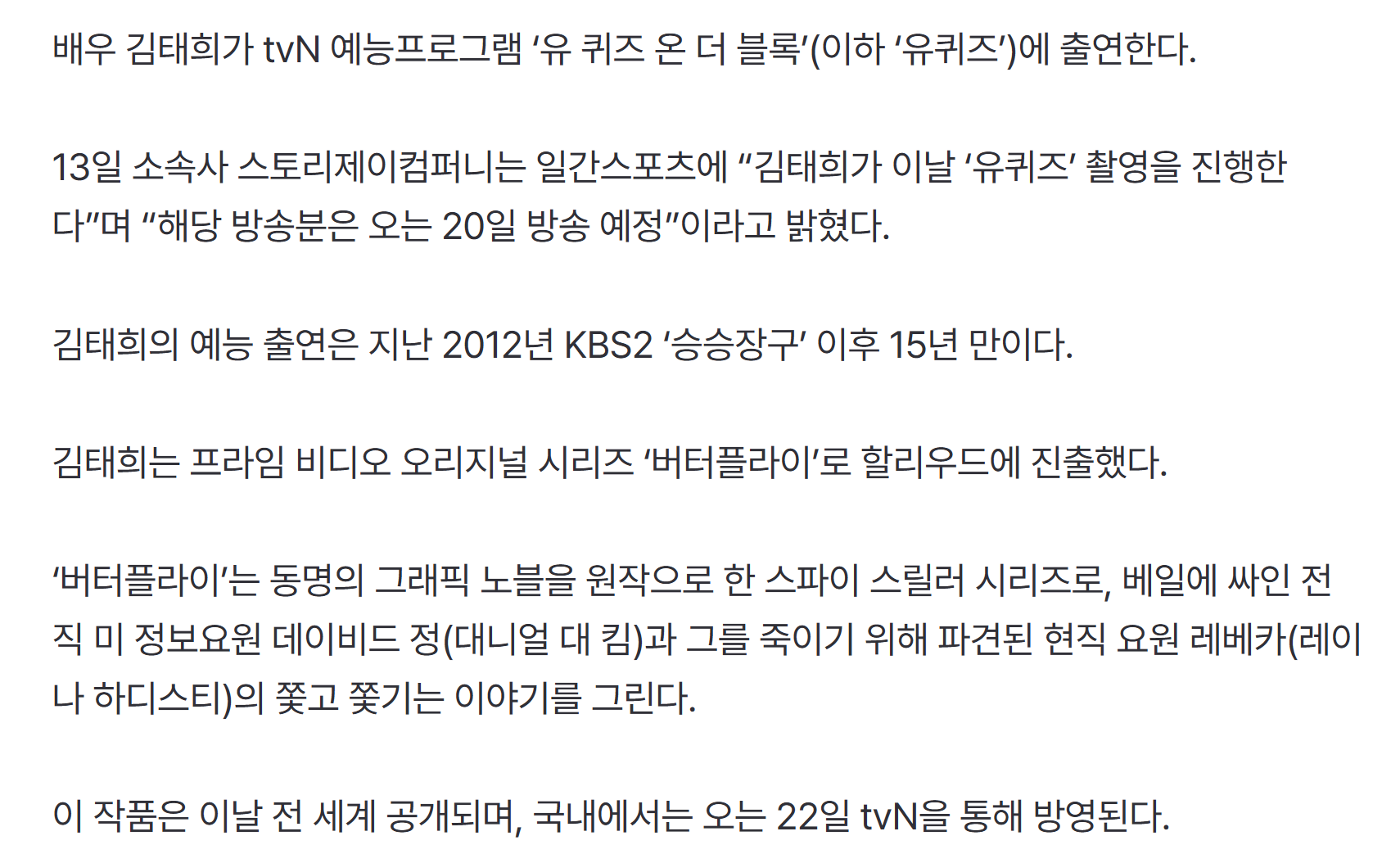 [연예]김태희, '유퀴즈' 녹화... 15년 만에 예능 출연 작성자서울스날|작성시간25.08.13|조회수8,043 목록 댓글 16 글자크기 작게가 글자크기 크게가 https://m.entertain.naver.com/home/article/241/0003459718 다음검색 현재 게시글 추가 기능 열기 북마크 공유하기 신고 센터로 신고 댓글 댓글 16 댓글쓰기 답글쓰기 댓글 리스트 작성자족구왕홍만섭 | 작성시간 25.08.13 세븐 ㅡㅡ 작성자Arsene Wenger | 작성시간 25.08.13 에잇 ㅡㅡ 답댓글 작성자HYNN박혜원 | 작성시간 25.08.13 아이유ㅡㅡ 작성자아저씨 | 작성시간 25.08.13 우왕 작성자갰랍랍 | 작성시간 25.08.13 눈 ㅡㅡ 댓글 전체보기