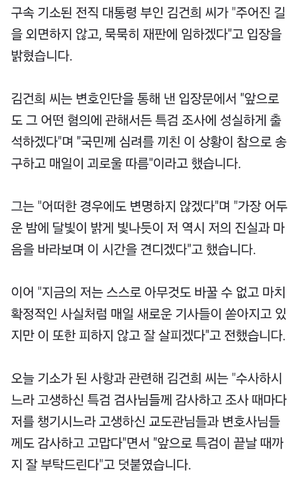 [기사]'구속기소' 김건희 "어두운 밤 달빛 빛나듯 이 시간 견디겠다" 작성자서울스날|작성시간25.08.29|조회수3,245 목록 댓글 94 글자크기 작게가 글자크기 크게가 https://n.news.naver.com/article/437/0000454727?sid=102'구속기소' 김건희 "어두운 밤 달빛 빛나듯 이 시간 견디겠다"구속 기소된 전직 대통령 부인 김건희 씨가 "주어진 길을 외면하지 않고, 묵묵히 재판에 임하겠다"고 입장을 밝혔습니다. 김건희 씨는 변호인단을 통해 낸 입장문에서 "앞으로도 그 어떤 혐의에 n.news.naver.com달빛 참 좋아함 다음검색 현재 게시글 추가 기능 열기 북마크 공유하기 신고 센터로 신고 댓글 댓글 94 댓글쓰기 답글쓰기 댓글 리스트 작성자이나경 | 작성시간 25.08.29 ㄴㅋㅋㅋㅋㅋㅋㅋㅋㅋㅋㅋㅋ 작성자오스카 아이작 | 작성시간 25.08.29 ㅋㅋ 작성자ppoo | 작성시간 25.08.29 진짜 어이가ㅡㅡ 작성자asapasap | 작성시간 25.08.30 뭔소리야 작성자유빈 | 작성시간 25.08.30 견디긴 뭘 견뎌 ㅅㅍ미친년이네 댓글 전체보기