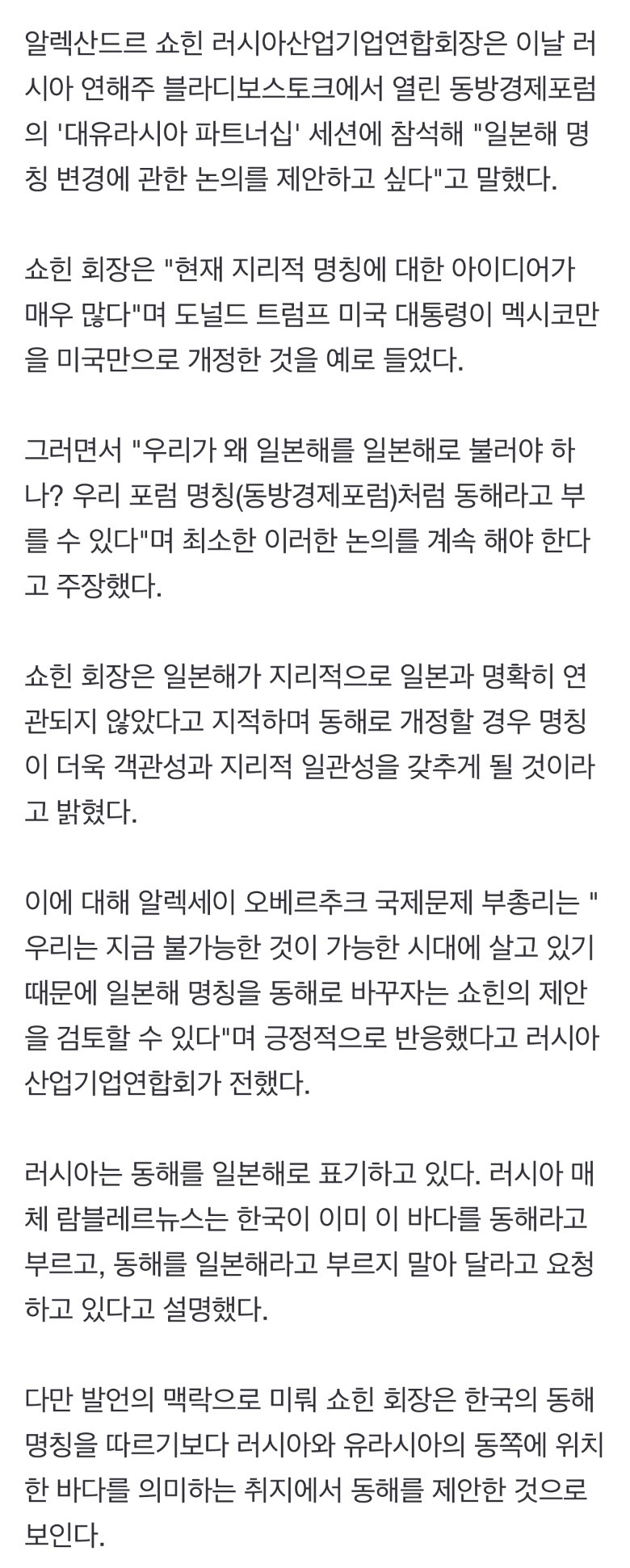 [기사]러시아 산업계대표 "일본해 아닌 동해로 부르자" 작성자solid|작성시간25.09.04|조회수2,221 목록 댓글 9 글자크기 작게가 글자크기 크게가 https://n.news.naver.com/article/001/0015606569?sid=104러시아 산업계대표 "일본해 아닌 동해로 부르자""일본과 명확한 연관 없어…동해가 더 객관적" 최인영 특파원 = 러시아 산업계를 대표하는 인물이 '일본해' 명칭을 '동해'로 바꾸는 논의를 시작하자고 제안했다고 타스 통신이 4일(현지시간) 보n.news.naver.com 다음검색 현재 게시글 추가 기능 열기 북마크 공유하기 신고 센터로 신고 댓글 댓글 9 댓글쓰기 답글쓰기 댓글 리스트 작성자한로로 | 작성시간 25.09.04 제가 알기로도 아시아 동쪽이라 동해인 의미도 있는걸로 아는디 작성자문도박사 | 작성시간 25.09.04 그래 잘해보자 작성자인간은 아는만큼 보인다 | 작성시간 25.09.05 왔다. 절호의 기회가 작성자래비드 | 작성시간 25.09.05 그래 잘한다!!!!! 작성자ppoo | 작성시간 25.09.05 오호 좋다 댓글 전체보기