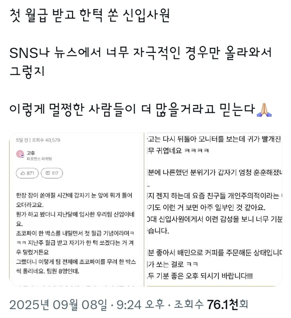 [기타]첫 월급 받고 한턱 쏜 신입사원 작성자Panzerkampfwagen|작성시간25.09.09|조회수7,272 목록 댓글 7 글자크기 작게가 글자크기 크게가 다음검색 현재 게시글 추가 기능 열기 북마크 공유하기 신고 센터로 신고 댓글 댓글 7 댓글쓰기 답글쓰기 댓글 리스트 작성자임화영 | 작성시간 25.09.09 귀엽다ㅋㅋㅋ 작성자RedDevils | 작성시간 25.09.09 ㅋㅋㅋㅋㅋㅋ훈훈 작성자현빈 | 작성시간 25.09.09 ㅋㅋㅋㅌㅌㅌㅌ귀가 빨개진거 귀엽 작성자JUST BRING IT | 작성시간 25.09.09 귀여웡 작성자무무링 | 작성시간 25.09.09 귀엽네 ㅋㅋㅋㅋㅋㅋ 댓글 전체보기