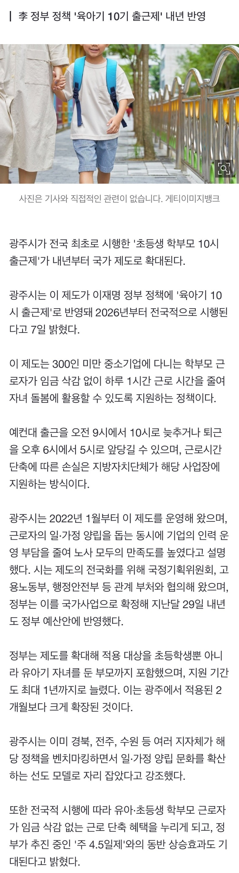 [기사]임금 삭감 없이 '초등생 학부모 10시 출근제', 내년부터 전국 시행 작성자치즈팝|작성시간25.09.09|조회수3,033 목록 댓글 20 글자크기 작게가 글자크기 크게가 광주시 '초등생 학부모 10시 출근제', 내년 전국으로 확대광주시가 전국 최초로 시행한 '초등생 학부모 10시 출근제'가 내년부터 국가 제도로 확대된다. 광주시는 이 제도가 이재명 정부 정책에 '육아기 10시 출근제'로 반영돼 2026년부터 전국적으로 시행n.news.naver.com 다음검색 현재 게시글 추가 기능 열기 북마크 공유하기 신고 센터로 신고 댓글 댓글 20 댓글쓰기 답글쓰기 댓글 리스트 답댓글 작성자로봇왕위잉치킹 | 작성시간 25.09.10 왜냥 답글 감사합니당ㅎ 작성자보건복지부 | 작성시간 25.09.09 제발 우리회사는 좀 하자 작성자제로코크 | 작성시간 25.09.09 강제가 아니면 실천되긴 어렵지 작성자GlueStick | 작성시간 25.09.09 대가리에 꽃밭. 가득하네 진짜 작성자한화 이글스 | 작성시간 25.09.09 미혼직딩들 엄청난 반발생길지도.. 본인들이 결혼했을때도 혜택본다는 먼 미래보단 당장의 업무량증가나 형평성이 먼저 따져질테니 댓글 전체보기