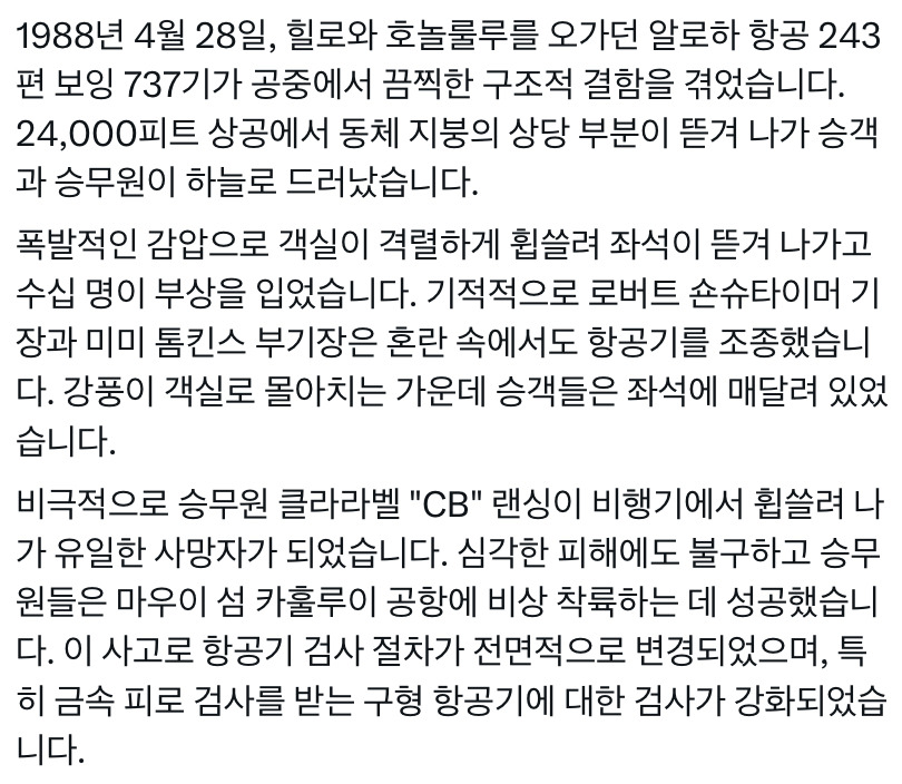 [정보]기적적으로 착륙에 성공했던 1988년 알로하항공 공중 동체 파괴사고.jpgif 작성자Real Reds|작성시간25.09.11|조회수5,089 목록 댓글 3 글자크기 작게가 글자크기 크게가 재현영상95명 탑승 94명 생존동체밖으로 쓸려나간 승무원 1명 사망 다음검색 현재 게시글 추가 기능 열기 북마크 공유하기 신고 센터로 신고 댓글 댓글 3 댓글쓰기 답글쓰기 댓글 리스트 작성자윤채 | 작성시간 25.09.11 헐 얼마나 공포스러웠을까.. 작성자Tensegrity Universe and Philosophy | 작성시간 25.09.11 헐.. 빅버스 같이 되어버렸네 작성자인유특전대 | 작성시간 25.09.11 와 저 기압이랑 소음을 견딜수 있는건가ㄷㄷ 댓글 전체보기