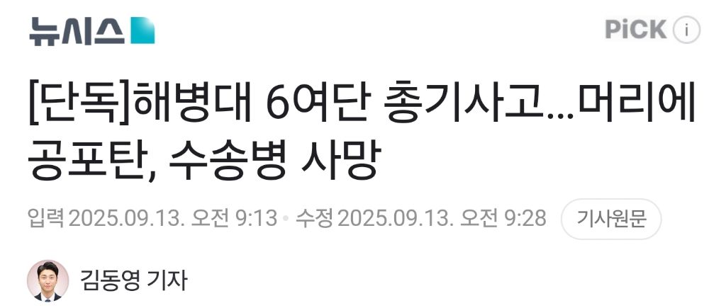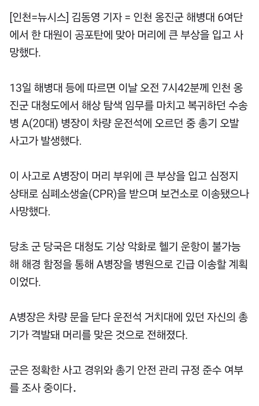 [기사][단독]해병대 6여단 총기사고…머리에 공포탄, 수송병 사망.gisa 작성자강동구주민 3|작성시간25.09.13|조회수3,443 목록 댓글 26 글자크기 작게가 글자크기 크게가 [단독]해병대 6여단 총기사고…머리에 공포탄, 수송병 사망인천 옹진군 해병대 6여단에서 한 대원이 공포탄에 맞아 머리에 큰 부상을 입고 사망했다. 13일 해병대 등에 따르면 이날 오전 7시42분께 인천 옹진군 대청도에서 해상 탐색 임무를 마치고 복귀하n.news.naver.com 다음검색 현재 게시글 추가 기능 열기 북마크 공유하기 신고 센터로 신고 댓글 댓글 26 댓글쓰기 답글쓰기 댓글 리스트 작성자오표시무해 | 작성시간 25.09.13 수송병 옆좌석에 책임자 동승 장교나 부사관 없나요..???? 작성자안드리쉐브첸코 | 작성시간 25.09.13 공포탄이라도 머리에 맞으면 죽을수도 있구나….. 작성자스티키 | 작성시간 25.09.13 조정간 안전 상태가 아니였나보네... 하... 작성자SOWON | 작성시간 25.09.13 삼가 고인의 명복을 빕니다. 작성자개깡이주인 | 작성시간 25.09.13 삼가 고인의 명복을 빕니다... 댓글 전체보기