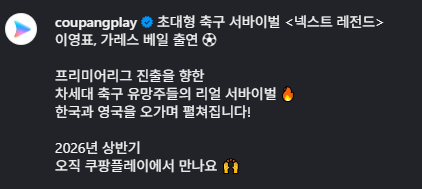 [기타]쿠팡플레이 26년 상반기 축구 서바이벌 프로그램 작성자rade bogdanovic|작성시간25.09.18|조회수1,377 목록 댓글 6 글자크기 작게가 글자크기 크게가 다음검색 현재 게시글 추가 기능 열기 북마크 공유하기 신고 센터로 신고 댓글 댓글 6 댓글쓰기 답글쓰기 댓글 리스트 작성자스타의일생 | 작성시간 25.09.18 한국 골프장이 마음에 들었나 봄 ㅋㅋㅋ 작성자Panzerkampfwagen | 작성시간 25.09.18 캬 베일 좋다 작성자광주 | 작성시간 25.09.18 온김에 한달살기하는건가? 작성자Gunners | 작성시간 25.09.18 헐 베일 ㅁㅊ ㅋㅋㅋ 이영표 인맥으로 섭외했나 작성자레프 야신 | 작성시간 25.09.18 ??: 토트넘 동료였던 베일과 이영표가 한국에서 같이 방송함 댓글 전체보기