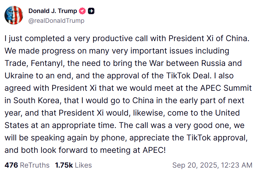 -틱톡 합의 승인에 대해 감사 의사를 표하고, 양측 모두 APEC 회담을 기대함.
