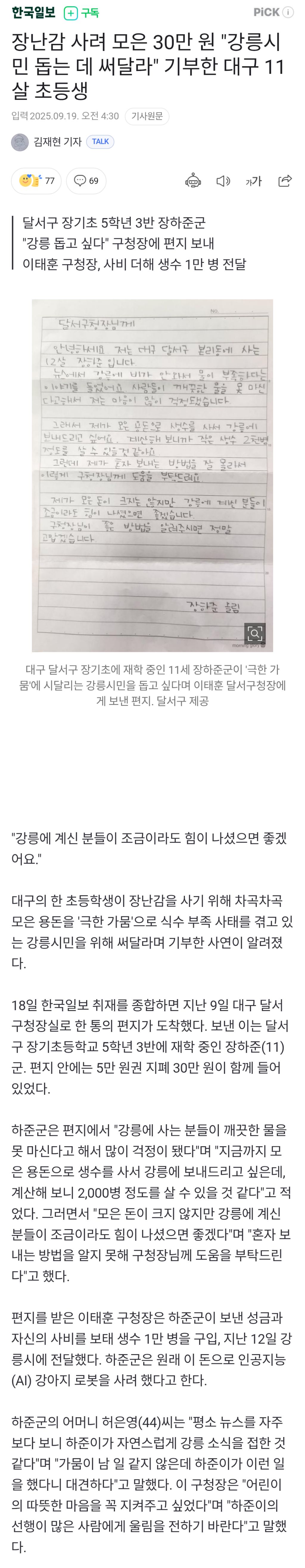 [기사]요즘 초등학생 근황 작성자러바오|작성시간25.09.22|조회수13,574 목록 댓글 22 글자크기 작게가 글자크기 크게가 https://n.news.naver.com/mnews/article/469/0000888027장난감 사려 모은 30만 원 "강릉시민 돕는 데 써달라" 기부한 대구 11살 초등생"강릉에 계신 분들이 조금이라도 힘이 나셨으면 좋겠어요." 대구의 한 초등학생이 장난감을 사기 위해 차곡차곡 모은 용돈을 '극한 가뭄'으로 식수 부족 사태를 겪고 있는 강릉시민을 위해 써달n.news.naver.com 다음검색 현재 게시글 추가 기능 열기 북마크 공유하기 신고 센터로 신고 댓글 댓글 22 댓글쓰기 답글쓰기 댓글 리스트 작성자Moonrise💙 | 작성시간 25.09.22 글자에서 바른 마음이 묻어난다 너는 천사구나♡ 작성자I.B.I LUV | 작성시간 25.09.22 작성자Kante | 작성시간 25.09.22 어린이에게 배웁니다 ㅜ 작성자SOWON | 작성시간 25.09.22 작성자추꾸죠아 | 작성시간 25.09.23 이게 상장이지 댓글 전체보기