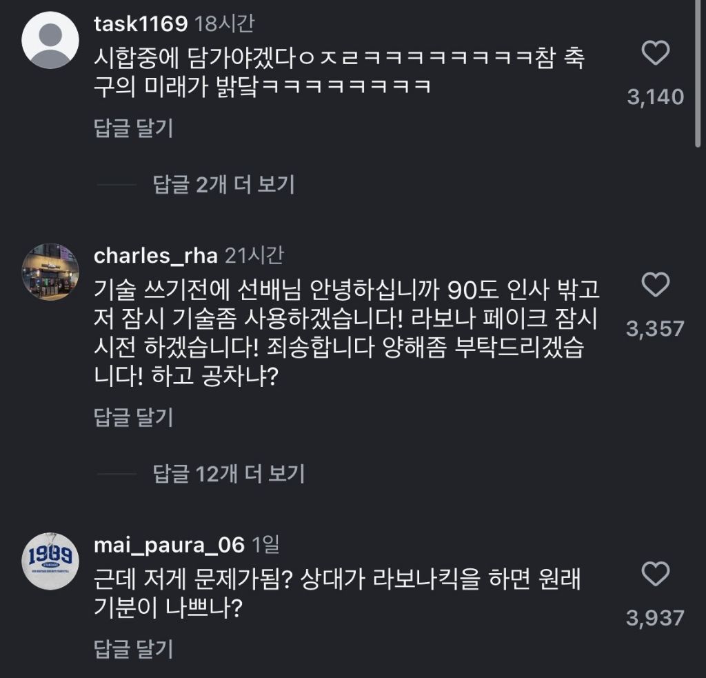 답댓글 작성자K. Mbappe 작성시간 25.09.29 진짜 그정도 생각은 아닐지언정 담가야겠다느니 그딴 말을 방송중인데 고작 라보나페이크에 빡쳐가지고 내뱉는거부터 이미 노이해