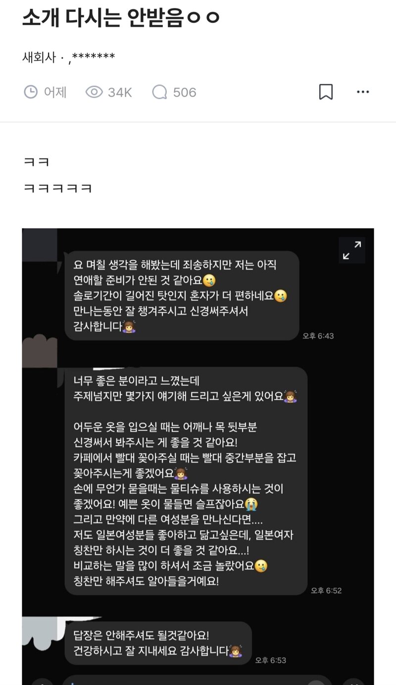 블라인드 소개팅 후기 작성자러바오|작성시간25.10.09|조회수9,494 목록 댓글 21 글자크기 작게가 글자크기 크게가 다음검색 현재 게시글 추가 기능 열기 북마크 공유하기 신고 센터로 신고 댓글 댓글 21 댓글쓰기 답글쓰기 댓글 리스트 작성자차무혁 | 작성시간 25.10.10 요새는 찌질한놈들이 그걸 합리적이라 생각함...이러니 출산율이 바닥이지.. 작성자우주 | 작성시간 25.10.10 말 진짜 곱게 하시네 작성자가소스 | 작성시간 25.10.10 여자분 너무 착하시네 작성자산티아고베르나베우 | 작성시간 25.10.10 와 ㅋㅋㅋㅋ 남자는 돈주고도 배우기 힘든건데 작성자yunalove | 작성시간 25.10.10 소개녀 고생 많았어요~ 댓글 전체보기