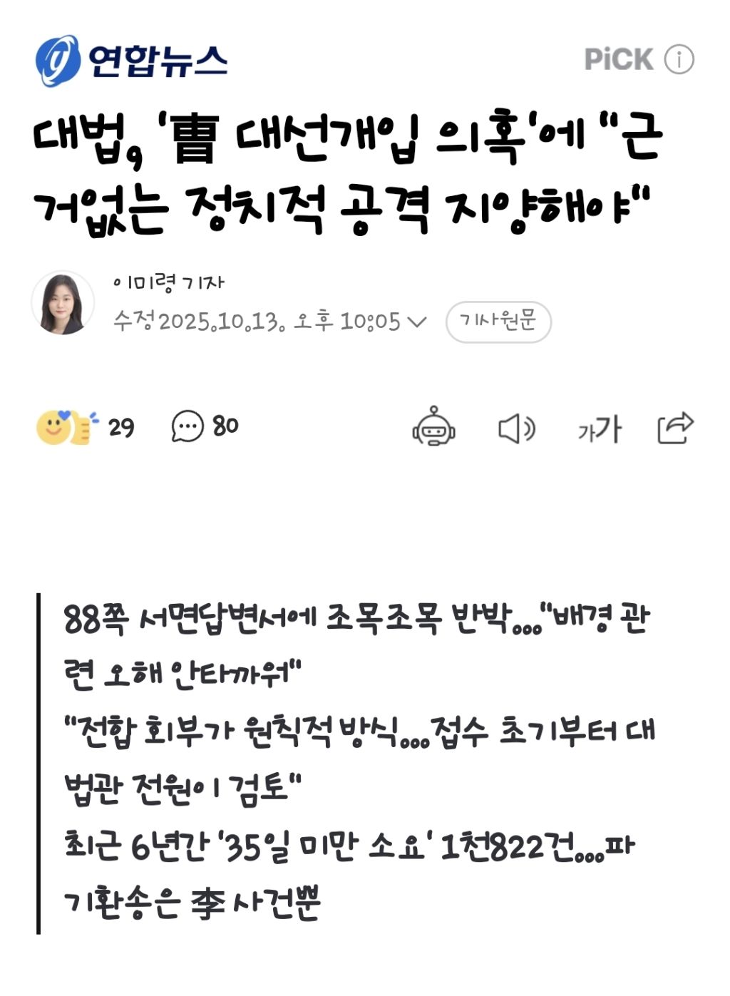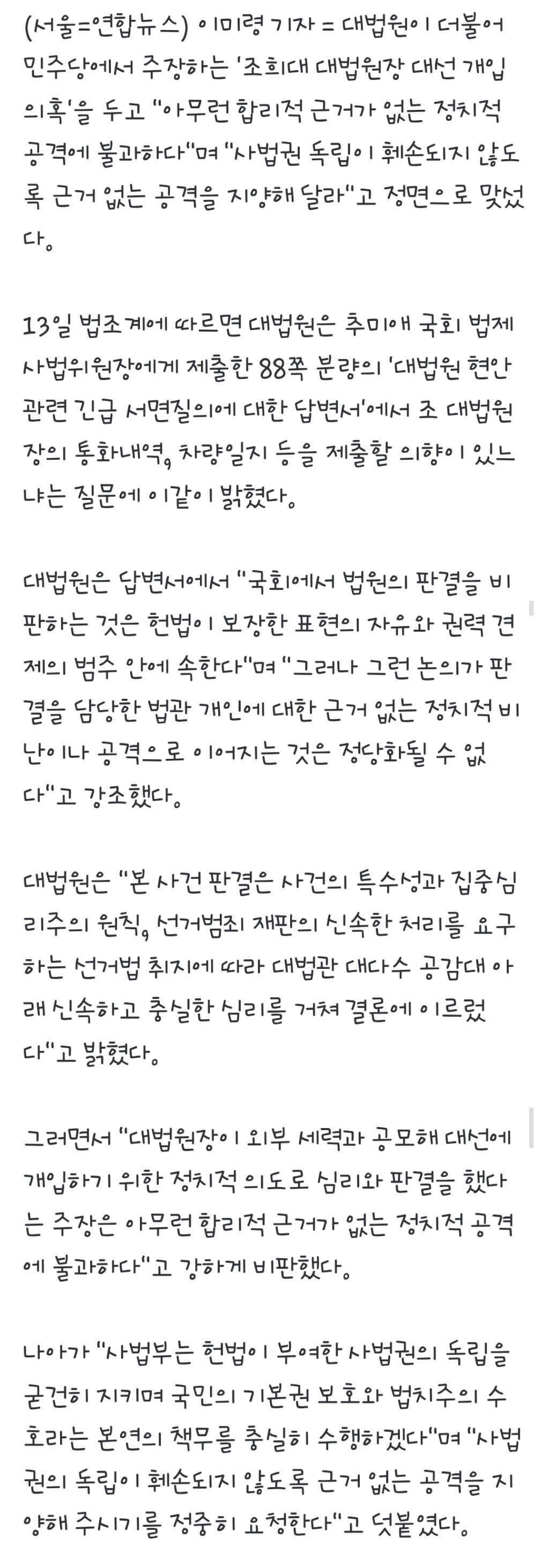 [기사]대법, '曺 대선개입 의혹'에 "근거없는 정치적 공격 지양해야" 작성자1억개의별|작성시간25.10.14|조회수823 목록 댓글 8 글자크기 작게가 글자크기 크게가 https://n.news.naver.com/article/001/0015675421?sid=102대법, '曺 대선개입 의혹'에 "근거없는 정치적 공격 지양해야"88쪽 서면답변서에 조목조목 반박…"배경 관련 오해 안타까워" "전합 회부가 원칙적 방식…접수 초기부터 대법관 전원이 검토" 최근 6년간 '35일 미만 소요' 1천822건…파기환송은 李 사건뿐 (서울=n.news.naver.com 다음검색 현재 게시글 추가 기능 열기 북마크 공유하기 신고 센터로 신고 댓글 댓글 8 댓글쓰기 답글쓰기 댓글 리스트 작성자Evan | 작성시간 25.10.14 조희대 지귀연 이넘은 민주당이 명운을걸고 조져야됨. 작성자오표시무해 | 작성시간 25.10.14 해명도 못하는 붕우유신들이 ㅋㅋ 작성자베놈베놈 | 작성시간 25.10.14 로그 기록이랑 관용차 출차기록 다 까고 우기라고 작성자쌩쌩 | 작성시간 25.10.14 판사나 검사나 진짜 다 윤석열이네개돼지 위에 법있네 작성자wlsss | 작성시간 25.10.14 의혹과 의심할 근거가 차고넘치는데 개소리해잡네 댓글 전체보기