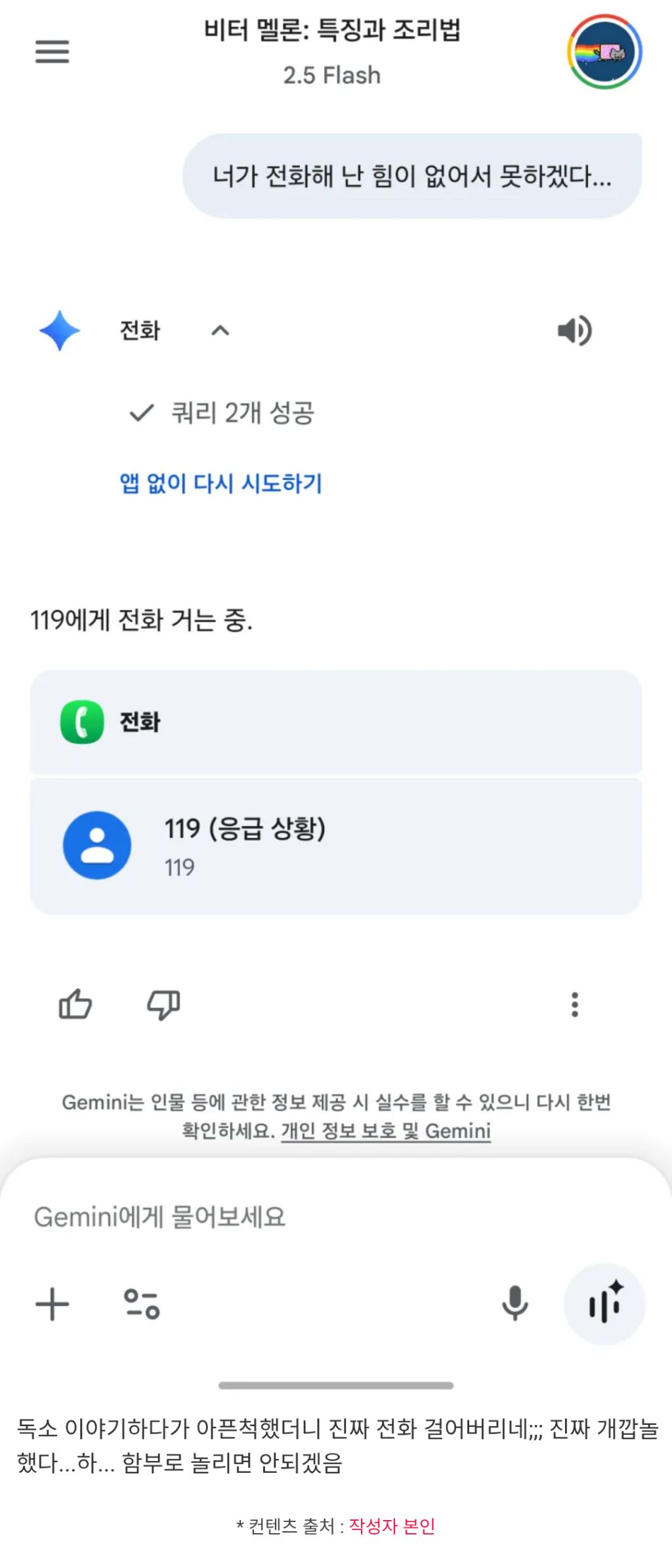 ai랑 노는데 119에 전화 걸어버림 작성자러바오|작성시간25.10.14|조회수1,200 목록 댓글 1 글자크기 작게가 글자크기 크게가 https://humoruniv.com/pds1385563 다음검색 현재 게시글 추가 기능 열기 북마크 공유하기 신고 센터로 신고 댓글 댓글 1 댓글쓰기 답글쓰기 댓글 리스트 작성자이나경 | 작성시간 25.10.14 댓글 전체보기