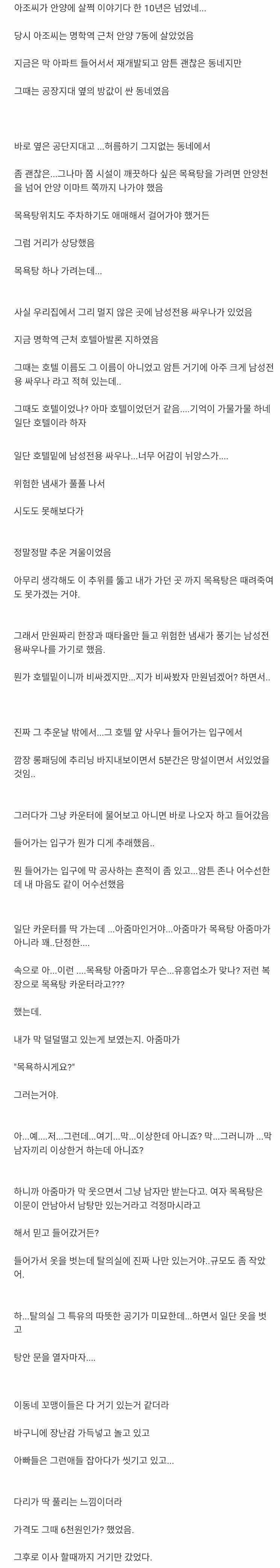 남성 전용 사우나 이용 후기 작성자러바오|작성시간25.10.14|조회수8,617 목록 댓글 3 글자크기 작게가 글자크기 크게가 다음검색 현재 게시글 추가 기능 열기 북마크 공유하기 신고 센터로 신고 댓글 댓글 3 댓글쓰기 답글쓰기 댓글 리스트 작성자내란의짐 | 작성시간 25.10.14 아쉽네 작성자총알로벤 | 작성시간 25.10.14 20대 직장초보시절에 회식하면 과장님들이 종로의 남성전용사우나 절대가지말라고 당한다고 그랬는데 거기도 그냥 루머인가 ㅎㅎ 작성자개밥 | 작성시간 25.10.14 아~ 뭔 퇴폐영업하는게 아니구나 댓글 전체보기