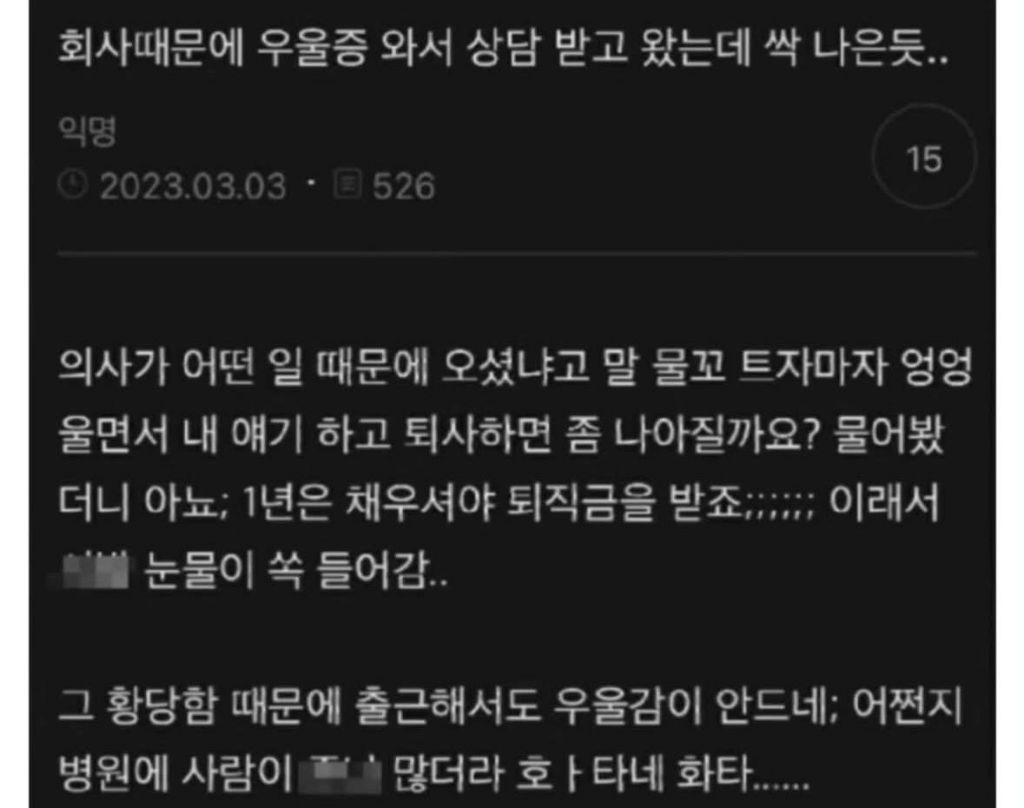 우울증 와서 상담받고 왔는데 작성자러바오|작성시간25.10.14|조회수19,260 목록 댓글 4 글자크기 작게가 글자크기 크게가 다음검색 현재 게시글 추가 기능 열기 북마크 공유하기 신고 센터로 신고 댓글 댓글 4 댓글쓰기 답글쓰기 댓글 리스트 작성자관악산노루점핑 | 작성시간 25.10.14 퇴직금 중요하지 우울한데 돈도 없으면 안됨 명의시네 작성자아메리카노 | 작성시간 25.10.14 ㅋㅋㅋ 그러면 1년도 안 돼서 우울증이 생긴 건가 작성자Overture! | 작성시간 25.10.14 사실 저 정도면 우울증은 아니긴 한데… ㅋㅋ 작성자금요일 | 작성시간 25.10.14 ㅋㅋㅋㅋㅋㅋㅋㅋ 댓글 전체보기