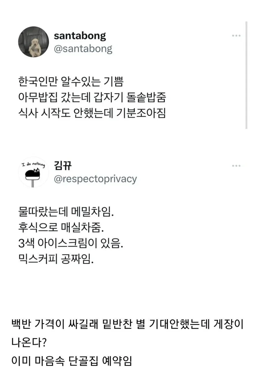 한국인이 대체로 공감하는 기쁨 작성자인조인간 17호|작성시간25.10.15|조회수12,569 목록 댓글 4 글자크기 작게가 글자크기 크게가 다음검색 현재 게시글 추가 기능 열기 북마크 공유하기 신고 센터로 신고 댓글 댓글 4 댓글쓰기 답글쓰기 댓글 리스트 작성자무무링 | 작성시간 25.10.15 돌솥밥 주면 내일 또 감 작성자시릴라 | 작성시간 25.10.15 돌솥밥은 제 취향은 아니긴한데 작성자미하엘 발꾸락 | 작성시간 25.10.15 전 돌솥밥나오는 뼈해장국집가서 밥먹을때 공기로 달라함 작성자금요일 | 작성시간 25.10.15 돌솥밥은 취향은 아닌데.. 댓글 전체보기