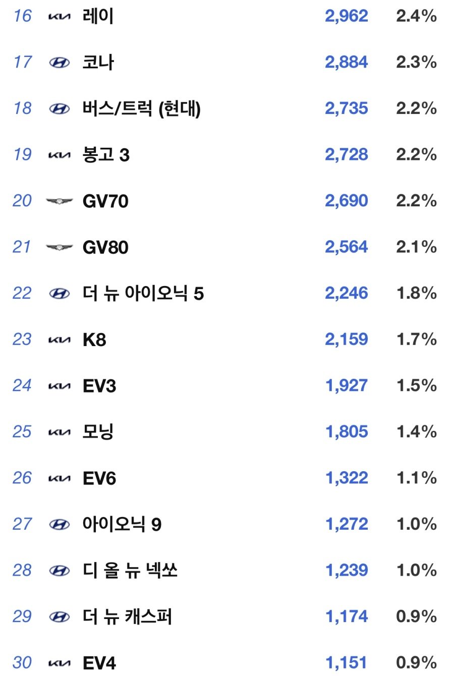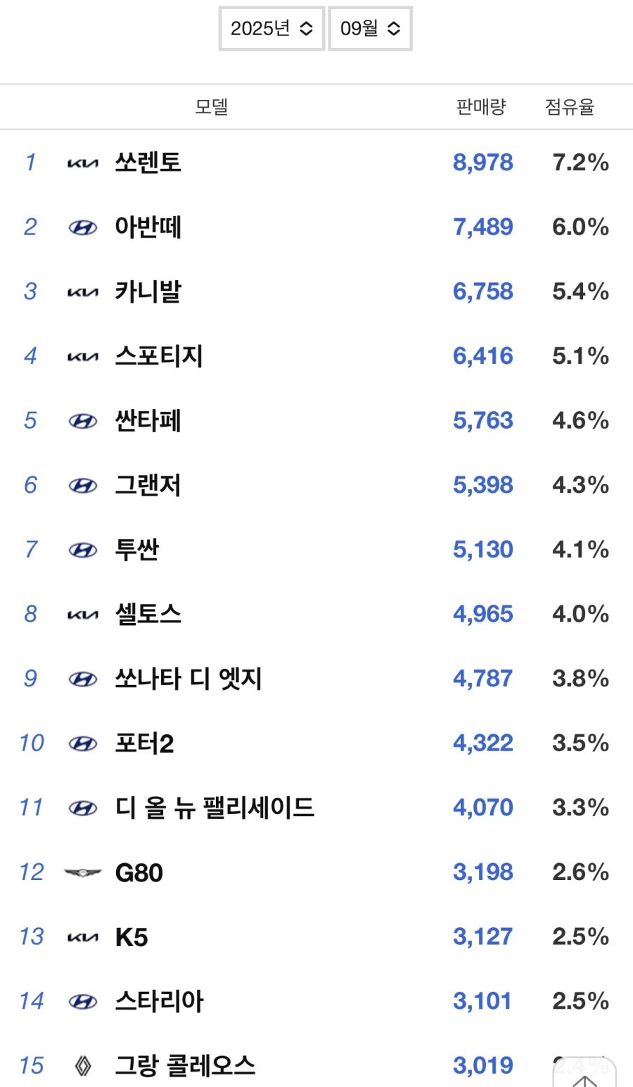 2025 9월 국산차 판매순위 작성자yeezy700v3|작성시간25.10.15|조회수3,237 목록 댓글 6 글자크기 작게가 글자크기 크게가 다음검색 현재 게시글 추가 기능 열기 북마크 공유하기 신고 센터로 신고 댓글 댓글 6 댓글쓰기 답글쓰기 댓글 리스트 작성자김사랑 | 작성시간 25.10.15 소나타는 이제 단종인가요?! 답댓글 작성자김사랑 | 작성시간 25.10.15 9위구나 작성자불가리스 | 작성시간 25.10.15 쏘렌토 불패ㄷㄷㄷ언제까지 갈지 작성자tnatropmI | 작성시간 25.10.15 쏘렌토 ㄷㄷ 작성자양관식 | 작성시간 25.10.15 쉐보레 순위에도 없네 .. 심각 댓글 전체보기