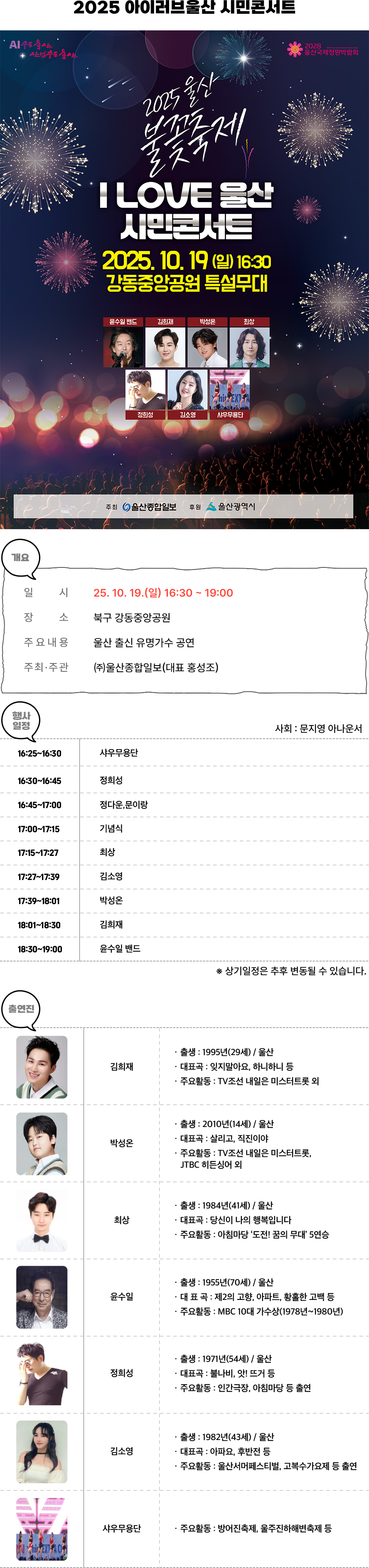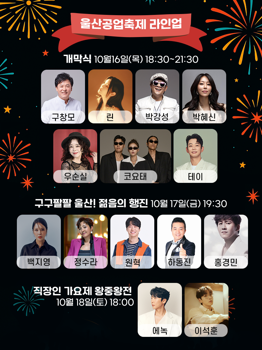 [연예]2025 울산 공업축제 공연 출연진 라인업.jpg 작성자탱구|작성시간25.10.15|조회수2,890 목록 댓글 3 글자크기 작게가 글자크기 크게가 다음검색 현재 게시글 추가 기능 열기 북마크 공유하기 신고 센터로 신고 댓글 댓글 3 댓글쓰기 답글쓰기 댓글 리스트 작성자금요일 | 작성시간 25.10.15 ㄷㄷ 작성자奇誠庸 | 작성시간 25.10.15 와 울산출신 가수들 많이 부르네요 작성자루이스 해밀턴 | 작성시간 25.10.16 박군은 안 오네 댓글 전체보기