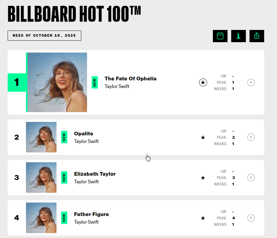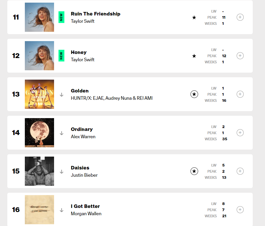 [음악]현시점 빌보드 핫 100 근황 ㄷㄷㄷㄷ 작성자그대는 츄날도|작성시간25.10.15|조회수4,146 목록 댓글 6 글자크기 작게가 글자크기 크게가 드디어 자연재해 등장8주연속 1위였던 골든13위로 급하락 1위부터 12위 그녀가 모두 차지 다음검색 현재 게시글 추가 기능 열기 북마크 공유하기 신고 센터로 신고 댓글 댓글 6 댓글쓰기 답글쓰기 댓글 리스트 작성자레드거너스 | 작성시간 25.10.15 ㄷㄷㄷㄷ 작성자루이스 나니 | 작성시간 25.10.15 그 녀 ㄷㄷ 작성자I’d rather be ashes than dust | 작성시간 25.10.15 골든이 과연 할로윈 부스터 먹고 다시 왕좌를 탈환할것인가 작성자보글 | 작성시간 25.10.15 으악 작성자피에르 가슬리 | 작성시간 25.10.15 아미유 댓글 전체보기
