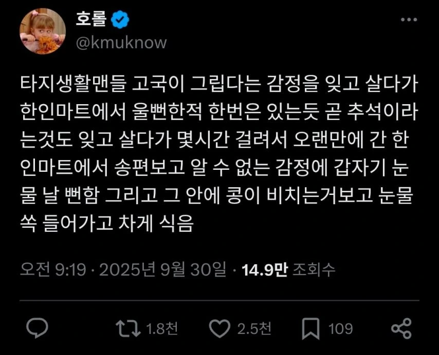 향수병에 특효약인 음식 작성자인조인간 17호|작성시간25.10.15|조회수6,408 목록 댓글 1 글자크기 작게가 글자크기 크게가 다음검색 현재 게시글 추가 기능 열기 북마크 공유하기 신고 센터로 신고 댓글 댓글 1 댓글쓰기 답글쓰기 댓글 리스트 작성자티에리 앙리 | 작성시간 25.10.15 ㅋㅋㅋㅋㅋ 댓글 전체보기