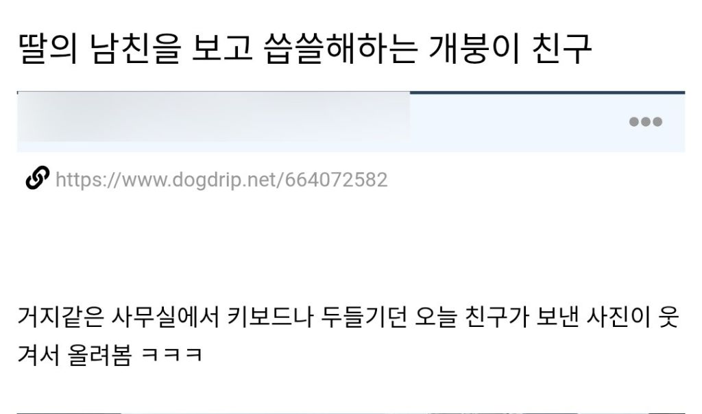 딸의 남친을 보고 씁쓸해하는 친구 작성자러바오|작성시간25.10.15|조회수72,670 목록 댓글 6 글자크기 작게가 글자크기 크게가 https://www.dogdrip.net/664072582 다음검색 현재 게시글 추가 기능 열기 북마크 공유하기 신고 센터로 신고 댓글 댓글 6 댓글쓰기 답글쓰기 댓글 리스트 작성자금요일 | 작성시간 25.10.16 ㅠ ㅋㅋ 작성자tnatropmI | 작성시간 25.10.16 ㅎㅎ 작성자Tensegrity Universe and Philosophy | 작성시간 25.10.16 언젠가는 마주하게 될 일 작성자MIC DROP | 작성시간 25.10.16 ??:아빠도 엄마 꼬셔서 결혼했자나!! 작성자cloud | 작성시간 25.10.16 아들을 두고 있어서 난 뿌듯할거 같은데 ㅋㅋ 딸이면 씁쓸하구나 댓글 전체보기