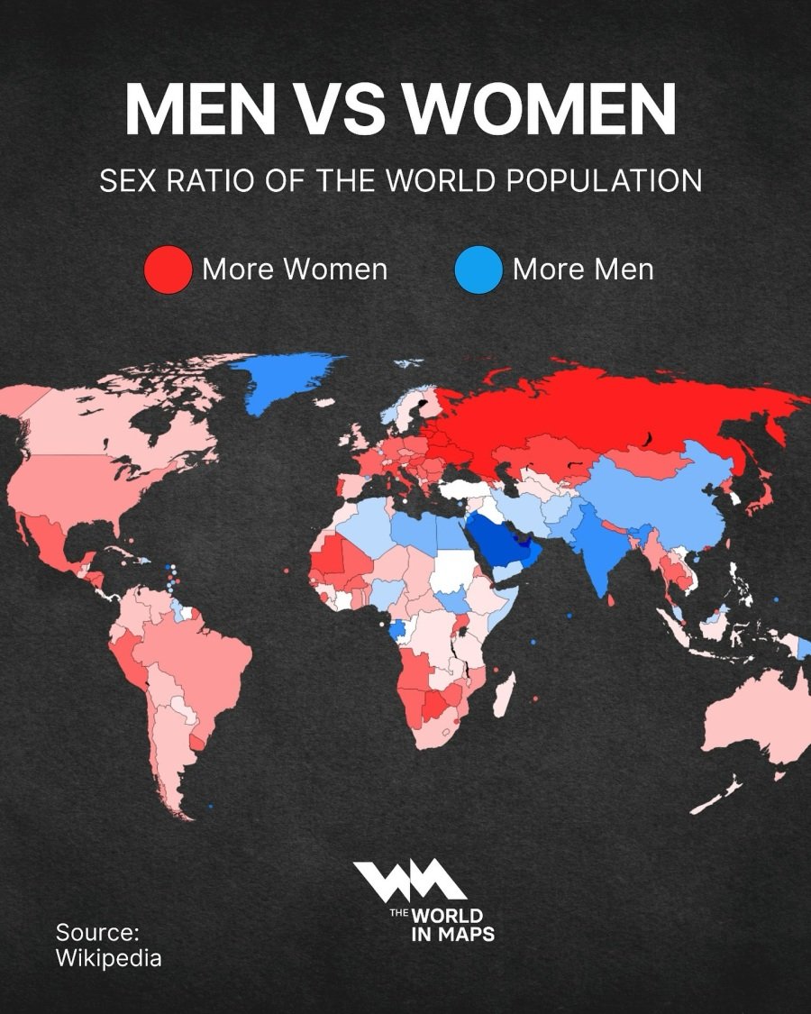 유럽, 러시아, 북미, 남미 일부, 동아시아 일부, 아프리카 일부 지역은 여성 인구가 더 많음(빨강 계열)
