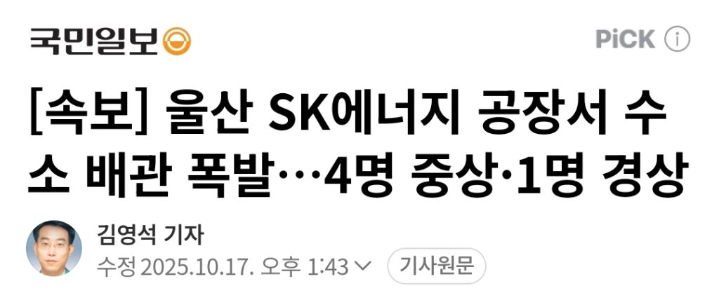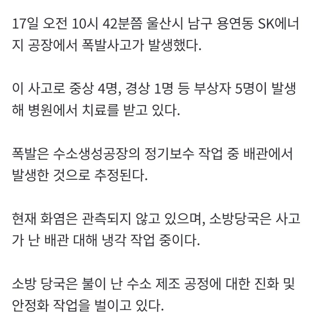 [기사][속보] 울산 SK에너지 공장서 수소 배관 폭발…4명 중상·1명 경상.gisa 작성자강동구주민 3|작성시간25.10.17|조회수9,787 목록 댓글 8 글자크기 작게가 글자크기 크게가 [속보] 울산 SK에너지 공장서 수소 배관 폭발…4명 중상·1명 경상17일 오전 10시 42분쯤 울산시 남구 용연동 SK에너지 공장에서 폭발사고가 발생했다. 이 사고로 중상 4명, 경상 1명 등 부상자 5명이 발생해 병원에서 치료를 받고 있다. 폭발은 수소생성공장의 정n.news.naver.com 다음검색 현재 게시글 추가 기능 열기 북마크 공유하기 신고 센터로 신고 댓글 댓글 8 댓글쓰기 답글쓰기 댓글 리스트 작성자HYNN박혜원 | 작성시간 25.10.17 헐 작성자QuaSaR | 작성시간 25.10.17 헐.. 작성자Nosleep | 작성시간 25.10.17 SK에너지면.. 민수 아버님이 다니셨던 곳 아닌가? 작성자상암의 중심에서 안양을 외치다 | 작성시간 25.10.17 친구,아는형님 재직자라 물어보는 중ㅠ 작성자왕자 | 작성시간 25.10.17 ㅜㅜ 댓글 전체보기