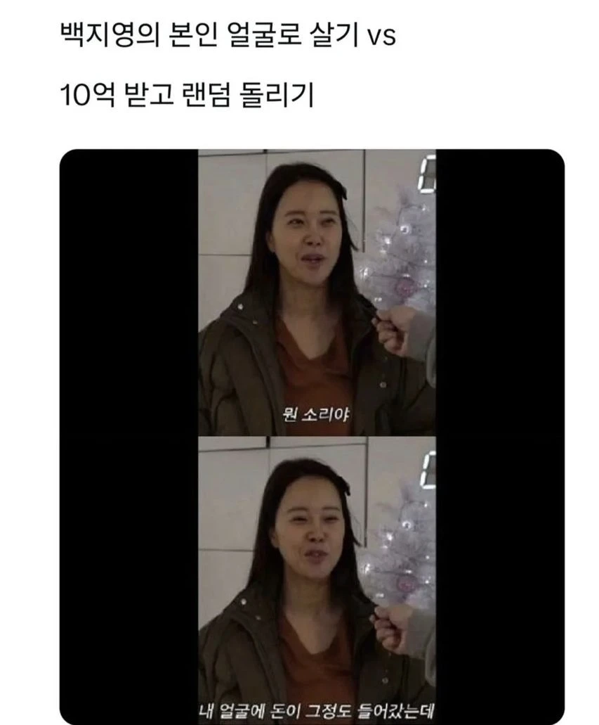 백지영 얼굴로 살기 vs 10억 받고 랜덤돌리기 작성자인조인간 17호|작성시간25.10.22|조회수8,399 목록 댓글 7 글자크기 작게가 글자크기 크게가 다음검색 현재 게시글 추가 기능 열기 북마크 공유하기 신고 센터로 신고 댓글 댓글 7 댓글쓰기 답글쓰기 댓글 리스트 작성자움프 | 작성시간 25.10.22 ㅋㅋㅋㅋㅋ 호탕하네요 작성자Tensegrity Universe and Philosophy | 작성시간 25.10.22 그니까 몸은 그대로인데 얼굴만 백지영으로 살아라는 말이죠? 작성자램파드 | 작성시간 25.10.22 ㅋㅋㅋㅋ실제로 봤는데 아우라 미쳤던데 작성자루이스 해밀턴 | 작성시간 25.10.22 앜ㅋㅋㅋㅋ 작성자이나경 | 작성시간 25.10.22 ㅋㅋㅋㅋㅋㅋㅋ 댓글 전체보기