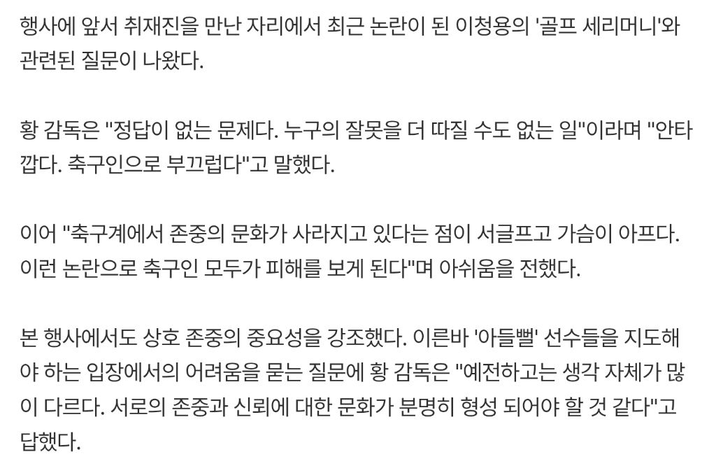 [축구기사]울산 '골프 사태' 바라본 황선홍 감독 "축구인으로 부끄럽다" 작성자Hailee Steinfeld|작성시간25.10.22|조회수4,297 목록 댓글 5 글자크기 작게가 글자크기 크게가 https://m.sports.naver.com/kfootball/article/448/0000565298울산 '골프 사태' 바라본 황선홍 감독 "축구인으로 부끄럽다"여기를 눌러 링크를 확인하세요m.sports.naver.com 다음검색 현재 게시글 추가 기능 열기 북마크 공유하기 신고 센터로 신고 댓글 댓글 5 댓글쓰기 답글쓰기 댓글 리스트 작성자운중천고라니 | 작성시간 25.10.22 Kfa로 망한거는 아니 부끄럽니? 작성자쏜흥민 | 작성시간 25.10.22 올림픽 탈락했던건? 작성자내란의짐 | 작성시간 25.10.22 올림픽떨궈놓고바로k리그 감독 주워먹는게더 부끄러운듯 작성자루이스 해밀턴 | 작성시간 25.10.22 서울시절 박주영한테 하신 건 생각 안 나시나요? 작성자야민 라말 | 작성시간 25.10.22 올림픽 떨구고 사과라도 하셨던가 댓글 전체보기