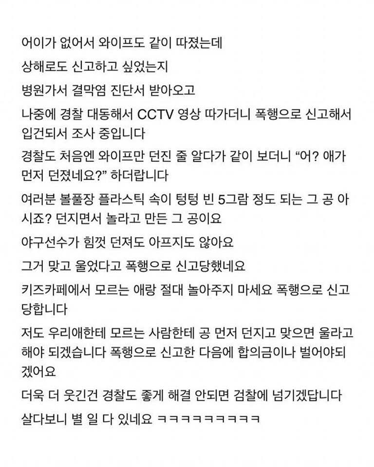 작성자Dennis Cirkin 작성시간 25.10.22 키즈 카페가 애기들 놀게하고 어른들 쉬는 용도긴해도 어린 친구들은 큰 애들이랑 부딫힐 위험도 있고 놀이기구들 제대로 활용을 못하니 당연히 놀아줘야하는데 그 시기의 아이들마저 방치하는 부모들이 부지기수인거 같아요. 저는 애는 없고 조카랑 몇번 갔는데 조카가 조그만해서 불안해서 거의 붙어다녔고 키즈카페 두시간 다녀오니 풋살 풀타임 뛴 피곤함이 몰려오더군요 ㅋㅋㅋ