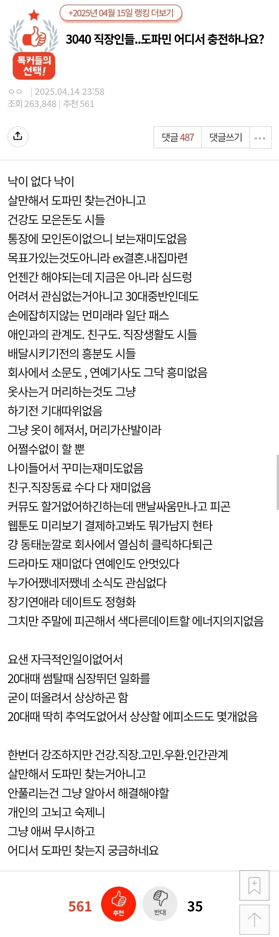 3040 직장인들 도파민 어디서 충전하나요? 작성자러바오|작성시간25.10.22|조회수8,320 목록 댓글 47 글자크기 작게가 글자크기 크게가 다음검색 현재 게시글 추가 기능 열기 북마크 공유하기 신고 센터로 신고 댓글 댓글 47 댓글쓰기 답글쓰기 댓글 리스트 작성자akaJB | 작성시간 25.10.23 낚시 작성자프리미에르 | 작성시간 25.10.23 어떻게든 뭐라더 재미를 붙여야죠 작성자시릴라 | 작성시간 25.10.23 그냥 사는거지 작성자베토벤 | 작성시간 25.10.23 내친구들 중에도 20대때부터 뭐 재밌는거 없냐고 물어보는애들이 있었는데, 아무것도 못즐기고 그냥 아직도 살아가는중. 작성자덤앤더머 | 작성시간 25.10.23 소확행을 하믄 생각보다 즐겁던데. 댓글 전체보기