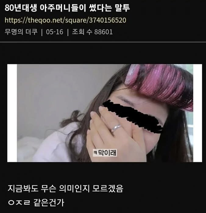 아주머니들이 썼다는 말투 작성자가을날3|작성시간25.10.23|조회수14,145 목록 댓글 7 글자크기 작게가 글자크기 크게가 다음검색 현재 게시글 추가 기능 열기 북마크 공유하기 신고 센터로 신고 댓글 댓글 7 댓글쓰기 답글쓰기 댓글 리스트 작성자서울대한의학과 | 작성시간 25.10.23 같은 거임 작성자No Sana, No Life | 작성시간 25.10.23 진짜 이상한 추임새임ㅋㅋㅋㅋㅋ 작성자tnatropmI | 작성시간 25.10.23 ㄷㄷ 작성자Totti | 작성시간 25.10.23 박막례 작성자아저씨 | 작성시간 25.10.23 이지랄ㅋ 댓글 전체보기