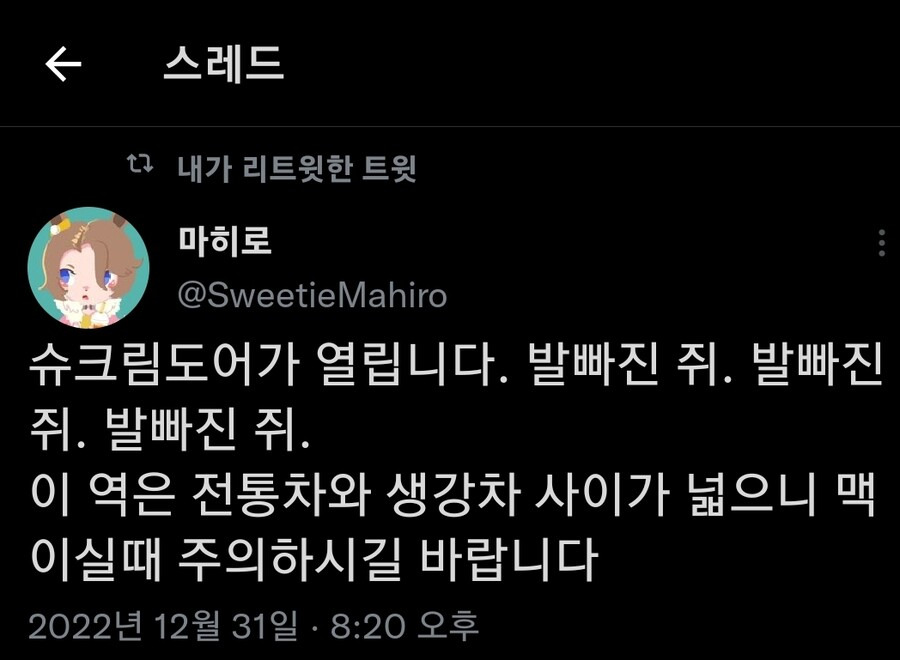 슈크림도어가 열립니다. 발빠진 쥐, 발빠진 쥐 작성자Google|작성시간25.10.24|조회수7,508 목록 댓글 10 글자크기 작게가 글자크기 크게가 다음검색 현재 게시글 추가 기능 열기 북마크 공유하기 신고 센터로 신고 댓글 댓글 10 댓글쓰기 답글쓰기 댓글 리스트 답댓글 작성자꿈꾸는피치 | 작성시간 25.10.24 오옷! 뭔생각해~! 답댓글 작성자Farrokh Bulsara | 작성시간 25.10.24 꿈꾸는피치 여기는 동작구 반지하구여~ 답댓글 작성자Lovelyz 류수정 | 작성시간 25.10.24 발빠진 쥐 잊혀지지가 않아요ㅋㅋㅋㅋ 작성자금요일 | 작성시간 25.10.24 ㅋㅋㅋㅋㅋㅋㅋㅋㅋ 작성자심심해 | 작성시간 25.10.24 ㅋㅋㅋ 댓글 전체보기