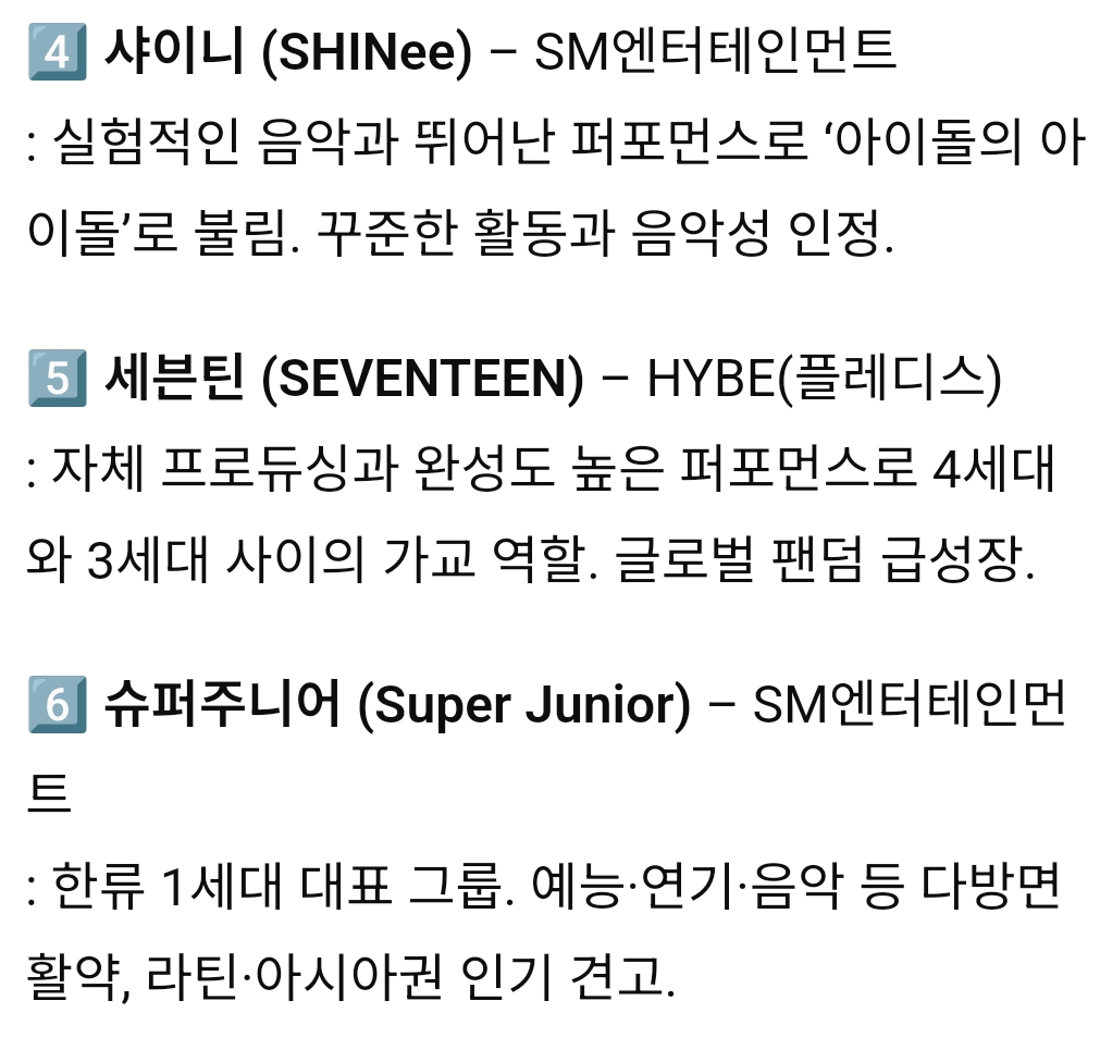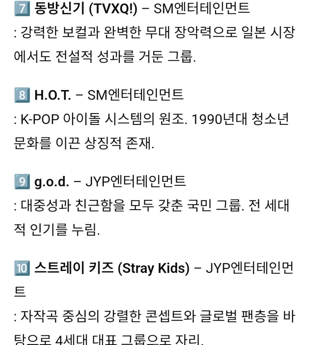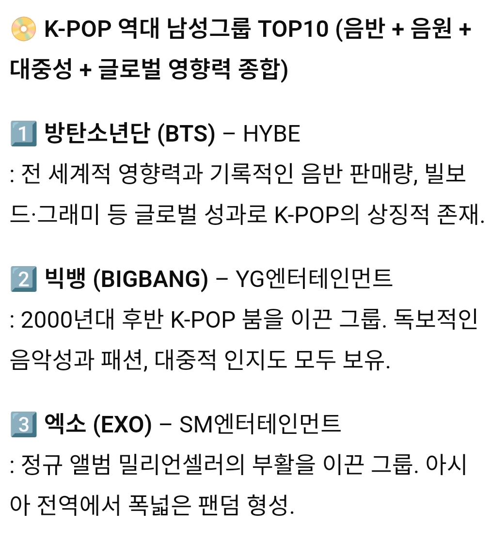 K-POP 역대 남성그룹, 여성그룹 TOP 10 작성자서강대학교|작성시간25.10.24|조회수6,941 목록 댓글 26 글자크기 작게가 글자크기 크게가 다음검색 현재 게시글 추가 기능 열기 북마크 공유하기 신고 센터로 신고 댓글 댓글 26 댓글쓰기 답글쓰기 댓글 리스트 답댓글 작성자Dennis Cirkin | 작성시간 25.10.24 빅뱅을 모르신다구요? 작성자epic fail | 작성시간 25.10.24 여돌 노래중에서는 뉴진스꺼만 듣긴함 작성자Dennis Cirkin | 작성시간 25.10.24 순위가 아니라 걍 10팀 뽑은거 같은디 답댓글 작성자레스리 | 작성시간 25.10.24 데뷔순도아니고순서가 순위로보일수밖에없는배열 작성자마스터키튼처럼 | 작성시간 25.10.24 슈주가 6위는 아니잖아 ㅋㅋ 댓글 전체보기