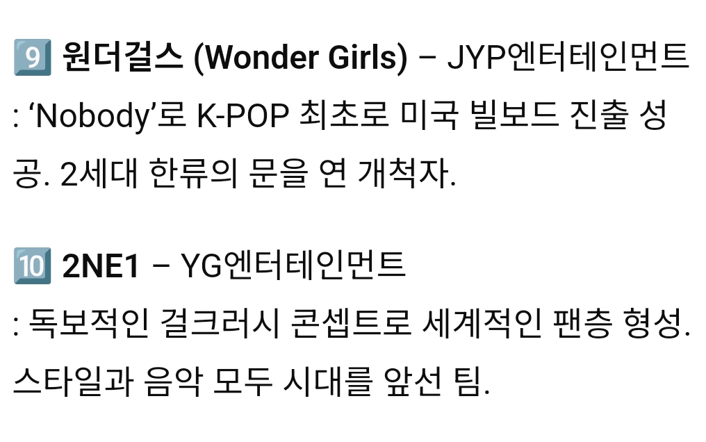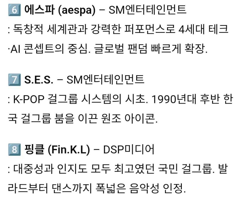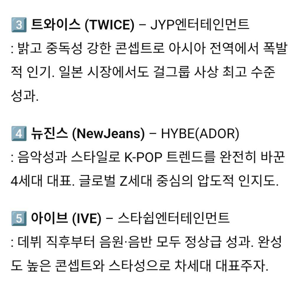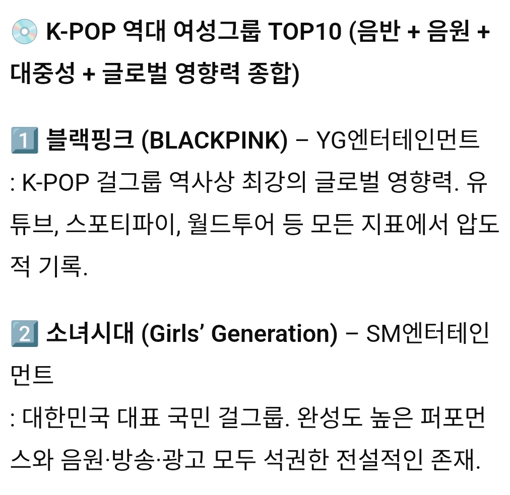 K-POP 역대 남성그룹, 여성그룹 TOP 10 작성자서강대학교|작성시간25.10.24|조회수6,941 목록 댓글 26 글자크기 작게가 글자크기 크게가 다음검색 현재 게시글 추가 기능 열기 북마크 공유하기 신고 센터로 신고 댓글 댓글 26 댓글쓰기 답글쓰기 댓글 리스트 답댓글 작성자Dennis Cirkin | 작성시간 25.10.24 빅뱅을 모르신다구요? 작성자epic fail | 작성시간 25.10.24 여돌 노래중에서는 뉴진스꺼만 듣긴함 작성자Dennis Cirkin | 작성시간 25.10.24 순위가 아니라 걍 10팀 뽑은거 같은디 답댓글 작성자레스리 | 작성시간 25.10.24 데뷔순도아니고순서가 순위로보일수밖에없는배열 작성자마스터키튼처럼 | 작성시간 25.10.24 슈주가 6위는 아니잖아 ㅋㅋ 댓글 전체보기