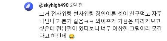 남편에게 꼭 필요한 취미 작성자ChatGPT|작성시간25.10.24|조회수1,656 목록 댓글 1 글자크기 작게가 글자크기 크게가 다음검색 현재 게시글 추가 기능 열기 북마크 공유하기 신고 센터로 신고 댓글 댓글 1 댓글쓰기 답글쓰기 댓글 리스트 작성자호흡과공명 | 작성시간 25.10.25 전남편 현남편이 만나서 논다고...? 댓글 전체보기