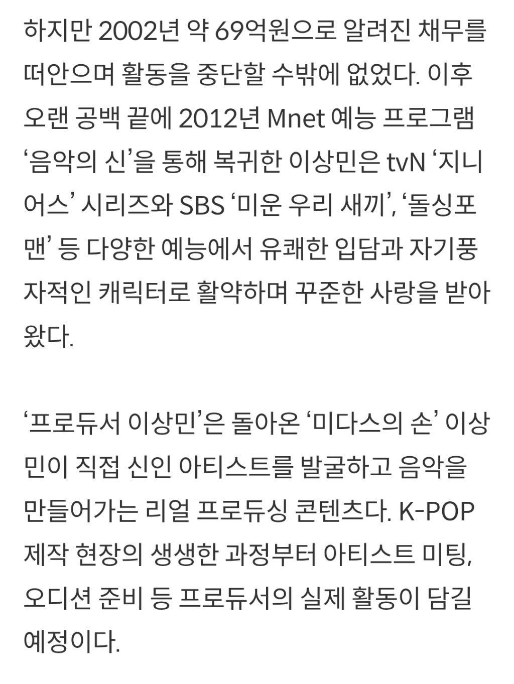 작성자레프 야신 작성시간 25.10.25 엠씨몽 소속가수들도 소비하는데, 이상민이라고 못할 것도 없지 생각할 수도. 그저 씁쓸
