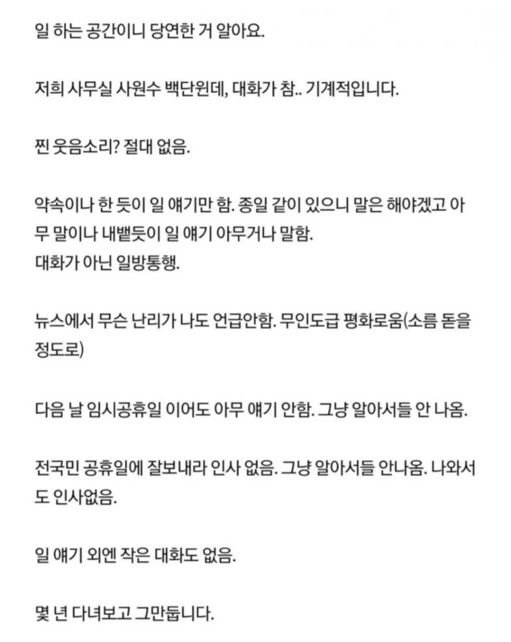 업무얘기 말곤 잡담 하나도 안하는 회사라 그만둔다는 사람 작성자러바오|작성시간25.10.25|조회수20,509 목록 댓글 27 글자크기 작게가 글자크기 크게가 다음검색 현재 게시글 추가 기능 열기 북마크 공유하기 신고 센터로 신고 댓글 댓글 27 댓글쓰기 답글쓰기 댓글 리스트 작성자싱스트리트 | 작성시간 25.10.25 저 정도로 재미없는것도 싫음 ㅠ 작성자로터스 | 작성시간 25.10.25 최고의 근무환경!! 답댓글 작성자다이나믹피치 | 작성시간 25.10.25 22 작성자I.B.I LUV | 작성시간 25.10.25 극단적인거도 그렇게 까진 좋지는.... 작성자이불밖은 위험해 | 작성시간 25.10.25 삭인 대화 싫음,, 댓글 전체보기