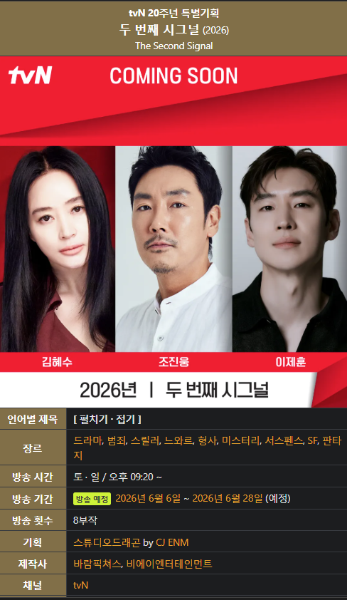 [정보]드라마 시그널2 (두번째 시그널) 방송 예정일 나옴 ㄷㄷ 작성자대한민국이 무너지고 있다.|작성시간25.10.26|조회수9,283 목록 댓글 16 글자크기 작게가 글자크기 크게가 다음검색 현재 게시글 추가 기능 열기 북마크 공유하기 신고 센터로 신고 댓글 댓글 16 댓글쓰기 답글쓰기 댓글 리스트 작성자데니스 코펜하겐 | 작성시간 25.10.26 아 8부작이라뇨!!!! 작성자Happy0906 | 작성시간 25.10.26 왜....왜....8부작.....아닐거야..... 작성자칸수 | 작성시간 25.10.26 8부작 너무 짧은데...12부작 정도 해주지.. 답댓글 작성자아이올로스 | 작성시간 25.10.27 22 떡밥 회수 하는 것만해도 8화는 너무 부족 답댓글 작성자감자가최고 | 작성시간 25.10.27 333 부족함 댓글 전체보기