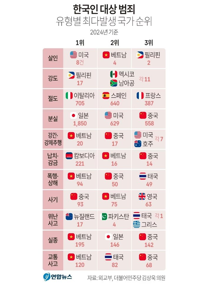 [정보]한국인 대상 범죄 유형별 최다발생 국가 순위(2024기준).jpg 작성자Real Reds|작성시간25.10.27|조회수3,391 목록 댓글 4 글자크기 작게가 글자크기 크게가 다음검색 현재 게시글 추가 기능 열기 북마크 공유하기 신고 센터로 신고 댓글 댓글 4 댓글쓰기 답글쓰기 댓글 리스트 작성자Lionel Messi No.10 | 작성시간 25.10.27 위난사고 ㄷㄷㄷ 산맥이나 숲속인가 작성자포항⭐샤비토비치 | 작성시간 25.10.27 일본에서 실종은 뭐지?그냥 잠적인가.태국에서 교통사고는 오토바이 택시 사고 일듯. 진짜 너무 빨리 달려서 무서워 죽는줄 작성자nananana | 작성시간 25.10.27 실종 왜 이렇게 많은거야 ㄷ ㄷ ㄷ 작성자레프 야신 | 작성시간 25.10.27 절도, 분실이 선녀로 보일 지경 댓글 전체보기