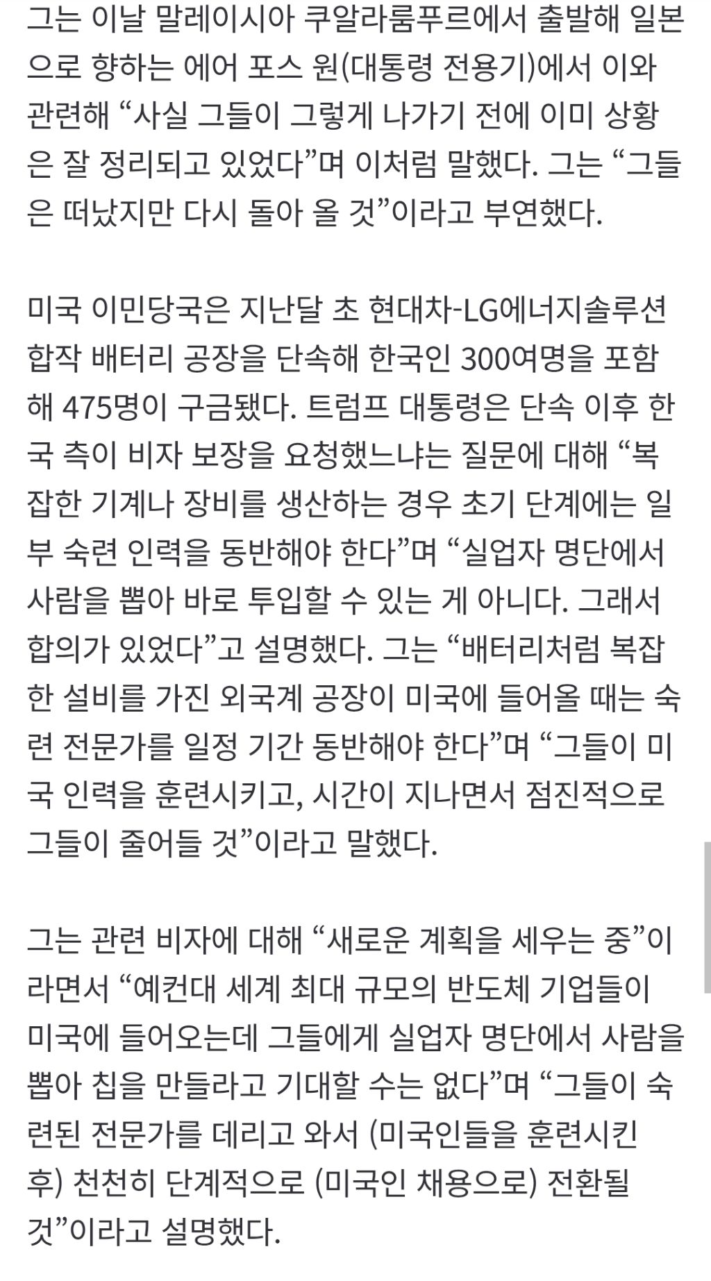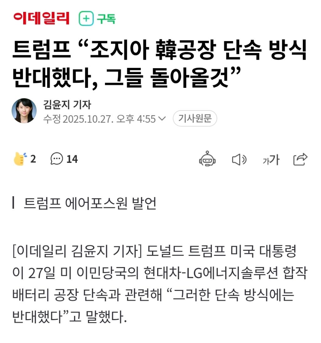 [기사]트럼프 “조지아 韓공장 단속 방식 반대했다, 그들 돌아올것”.gisa 작성자강동구주민 3|작성시간25.10.27|조회수4,037 목록 댓글 13 글자크기 작게가 글자크기 크게가 트럼프 “조지아 韓공장 단속 방식 반대했다, 그들 돌아올것”도널드 트럼프 미국 대통령이 27일 미 이민당국의 현대차-LG에너지솔루션 합작 배터리 공장 단속과 관련해 “그러한 단속 방식에는 반대했다”고 말했다. 27일(현지시간) 말레이시아 쿠알라룸푸n.news.naver.com 다음검색 현재 게시글 추가 기능 열기 북마크 공유하기 신고 센터로 신고 댓글 댓글 13 댓글쓰기 답글쓰기 댓글 리스트 작성자Rachel Anne McAdams | 작성시간 25.10.27 웃기고있네 작성자black.mam | 작성시간 25.10.27 극우와 국힘이 웃긴건 트럼프가 북한에 기웃 거리니 북한 얘기는 언제 그랬냐는 듯 쏙 들어감.테스와 극우들아 북한 타령 언제쯤 오더 내려 오니?? 작성자페르소나 | 작성시간 25.10.27 100%주도 작성자개솔수고 | 작성시간 25.10.27 응 뻑 작성자음악대학 | 작성시간 25.10.27 절대 보내면 안돼 댓글 전체보기