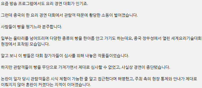 [기사]돌연 아수라장 된 요리 경연 대회…'황당 소동' 무슨 일이 작성자슈팅라이크종수|작성시간25.10.28|조회수6,208 목록 댓글 8 글자크기 작게가 글자크기 크게가 이게 뭔... 다음검색 현재 게시글 추가 기능 열기 북마크 공유하기 신고 센터로 신고 댓글 댓글 8 댓글쓰기 답글쓰기 댓글 리스트 작성자추워추워추워추워 | 작성시간 25.10.28 ㄴㅋㅋㅋㅋㅋㅋㅋ 작성자I.B.I LUV | 작성시간 25.10.28 그냥 사람 출입을 시키면 안되겠다.. 작성자금요일 | 작성시간 25.10.29 ㄷㄷ 작성자도도한 | 작성시간 25.10.29 진짜...절레절레... 작성자리암니슨 | 작성시간 25.10.29 여윾시~~ 댓글 전체보기