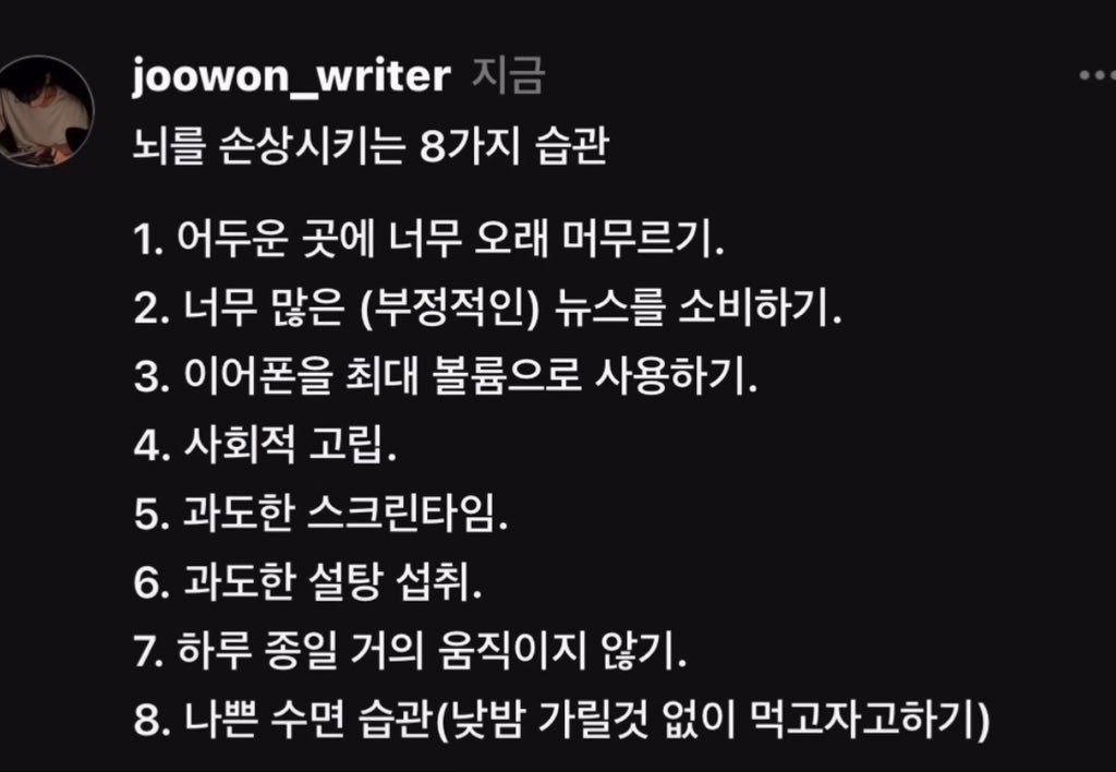 [기타]뇌를 손상시키는 8가지 습관 작성자음교수2|작성시간25.10.29|조회수6,303 목록 댓글 3 글자크기 작게가 글자크기 크게가 다음검색 현재 게시글 추가 기능 열기 북마크 공유하기 신고 센터로 신고 댓글 댓글 3 댓글쓰기 답글쓰기 댓글 리스트 작성자H_Crespo | 작성시간 25.10.29 1번 쇼킹하네여. 작성자Cole Jermaine Palmer | 작성시간 25.10.29 4번 ㅠㅠ 작성자tnatropmI | 작성시간 25.10.29 뇌 댓글 전체보기