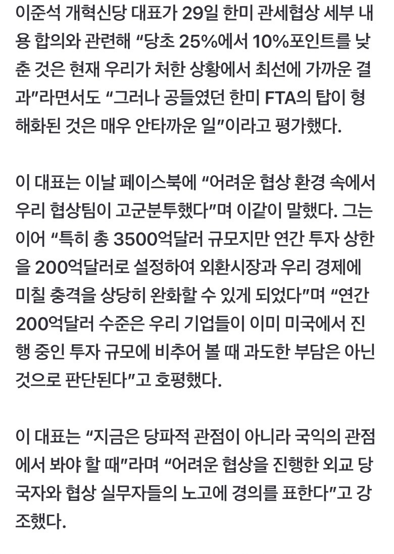[기사]이준석, 한미 관세협상 타결에 "최선에 가까운 결과" 호평 작성자solid|작성시간25.10.29|조회수3,545 목록 댓글 38 글자크기 작게가 글자크기 크게가 https://n.news.naver.com/article/011/0004549418?sid=100이준석, 한미 관세협상 타결에 "최선에 가까운 결과" 호평이준석 개혁신당 대표가 29일 한미 관세협상 세부 내용 합의와 관련해 “당초 25%에서 10%포인트를 낮춘 것은 현재 우리가 처한 상황에서 최선에 가까운 결과”라면서도 “그러나 공들였던 한미 Fn.news.naver.com 다음검색 현재 게시글 추가 기능 열기 북마크 공유하기 신고 센터로 신고 댓글 댓글 38 댓글쓰기 답글쓰기 댓글 리스트 작성자데미소다피치 | 작성시간 25.10.29 tRf da 작성자오표시무해 | 작성시간 25.10.30 얘는 수사 안받음? 작성자펀치 (Punch) | 작성시간 25.10.30 지가 뭔데 ㅋㅋㅋㅋㅋㅋㅋㅋㅋㅋㅋ 작성자아프리카TV | 작성시간 25.10.30 시끄러 임마 작성자페더스 맥그로우 | 작성시간 25.10.30 https://youtu.be/JkUhZwyoqJk 동영상 댓글 전체보기