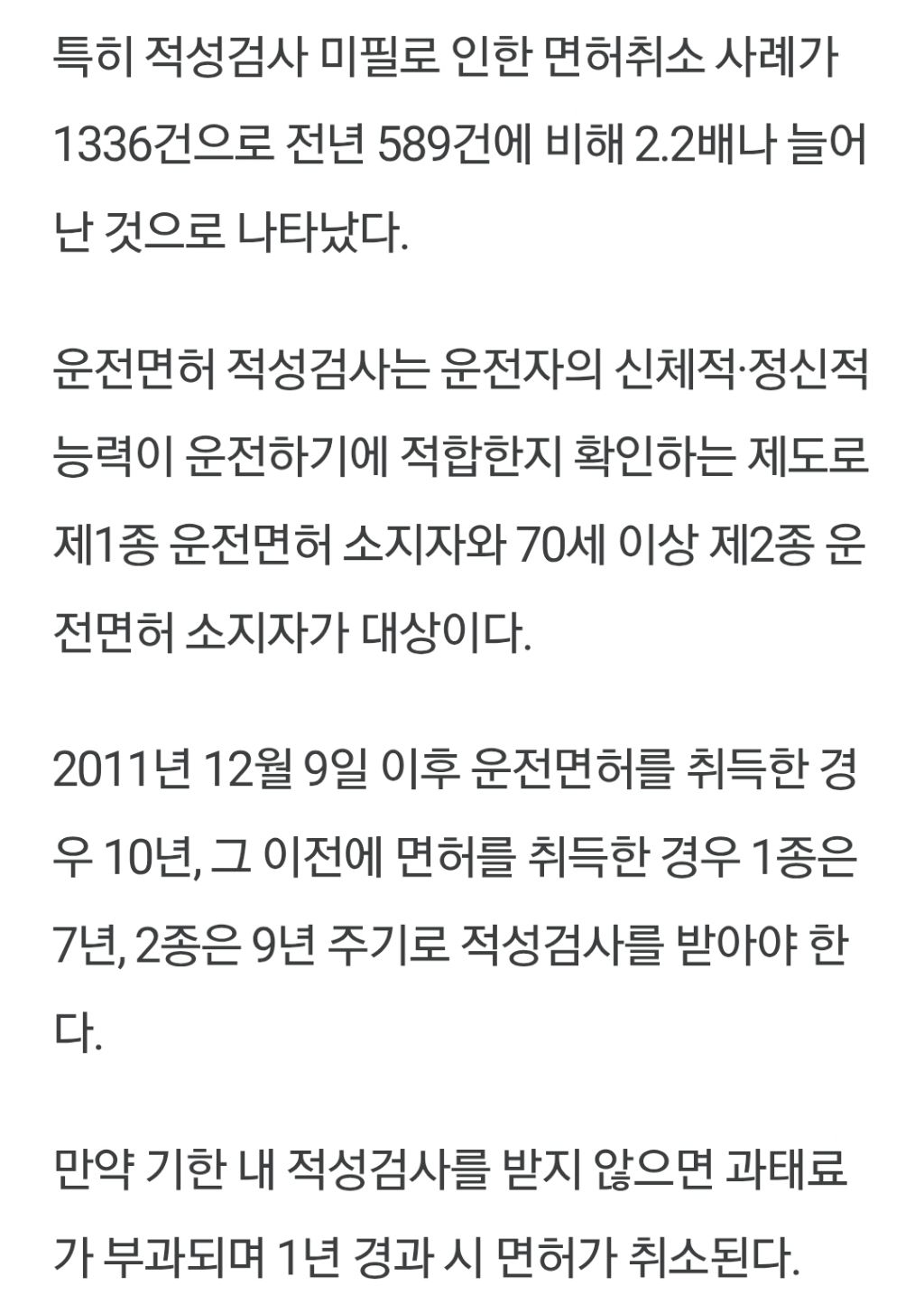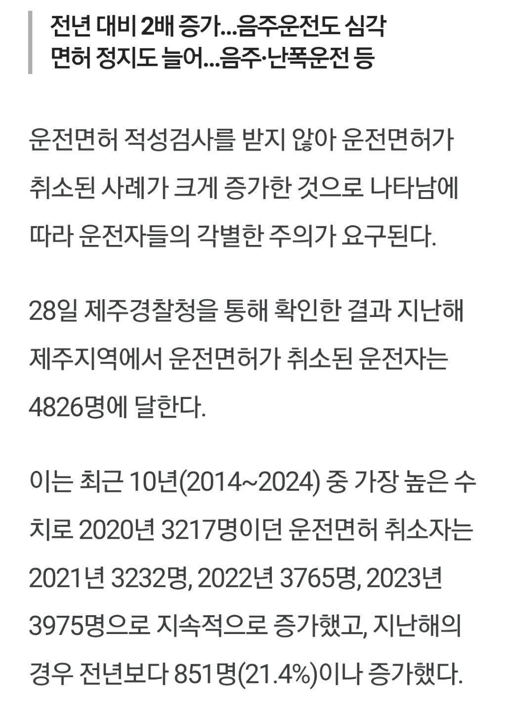 [기사]“아뿔싸” 적성검사 미필 운전면허 취소 급증 작성자Tove Styrke|작성시간25.10.30|조회수5,098 목록 댓글 2 글자크기 작게가 글자크기 크게가 https://www.jemin.com/news/articleView.html?idxno=829300“아뿔싸” 적성검사 미필 운전면허 취소 급증 - 제민일보운전면허 적성검사를 받지 않아 운전면허가 취소된 사례가 크게 증가한 것으로 나타남에 따라 운전자들의 각별한 주의가 요구된다.28일 제주경찰청을 통해 확인한 결과 지난해 제주지역에서 운www.jemin.com 다음검색 현재 게시글 추가 기능 열기 북마크 공유하기 신고 센터로 신고 댓글 댓글 2 댓글쓰기 답글쓰기 댓글 리스트 작성자난누군가또여긴어딘가. | 작성시간 25.10.30 내가 안받아서 취소가 됐지...ㅋㅋㅋ 작성자Pringles | 작성시간 25.10.30 놀라서 확인해봤음 ㅋㅋ 아직 남음. 댓글 전체보기