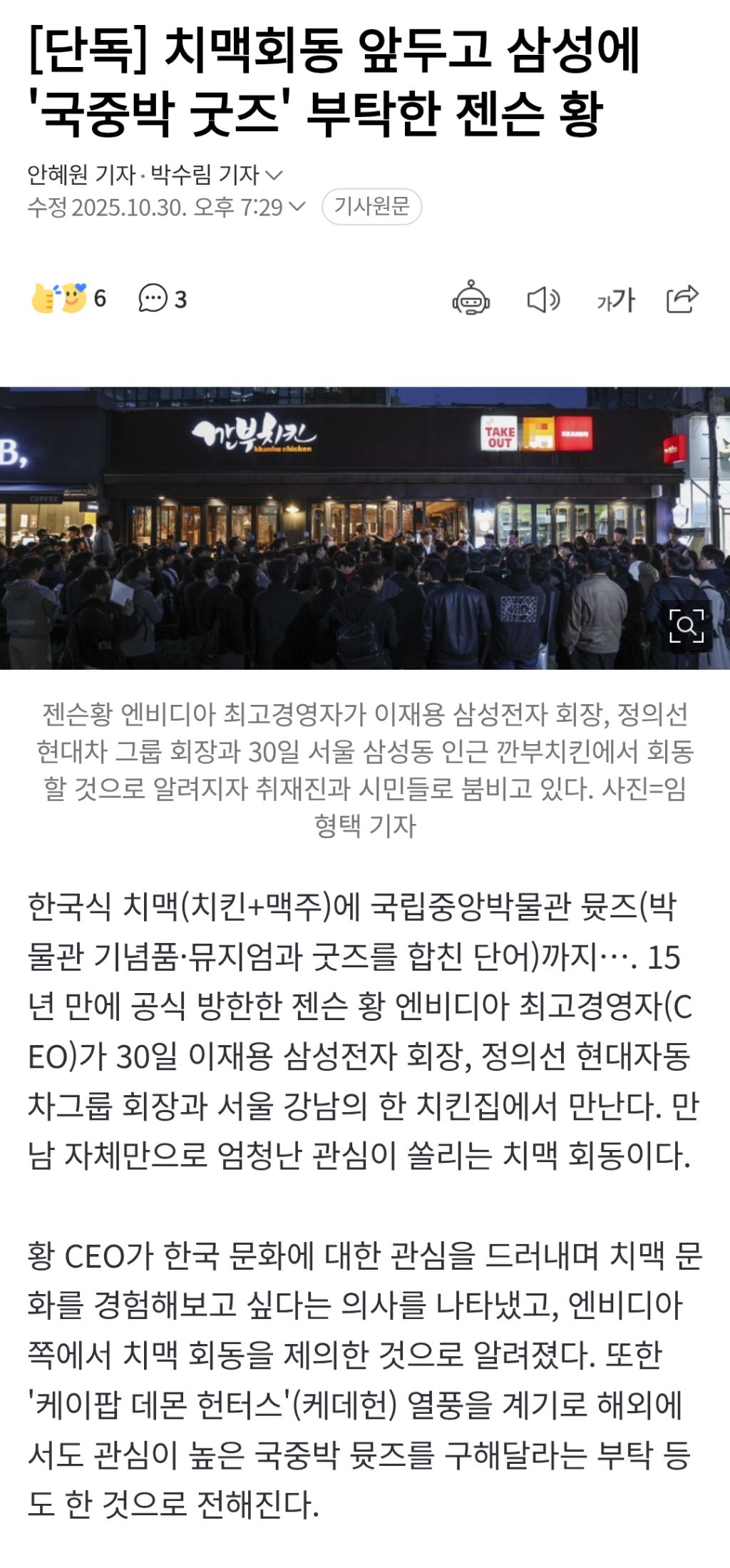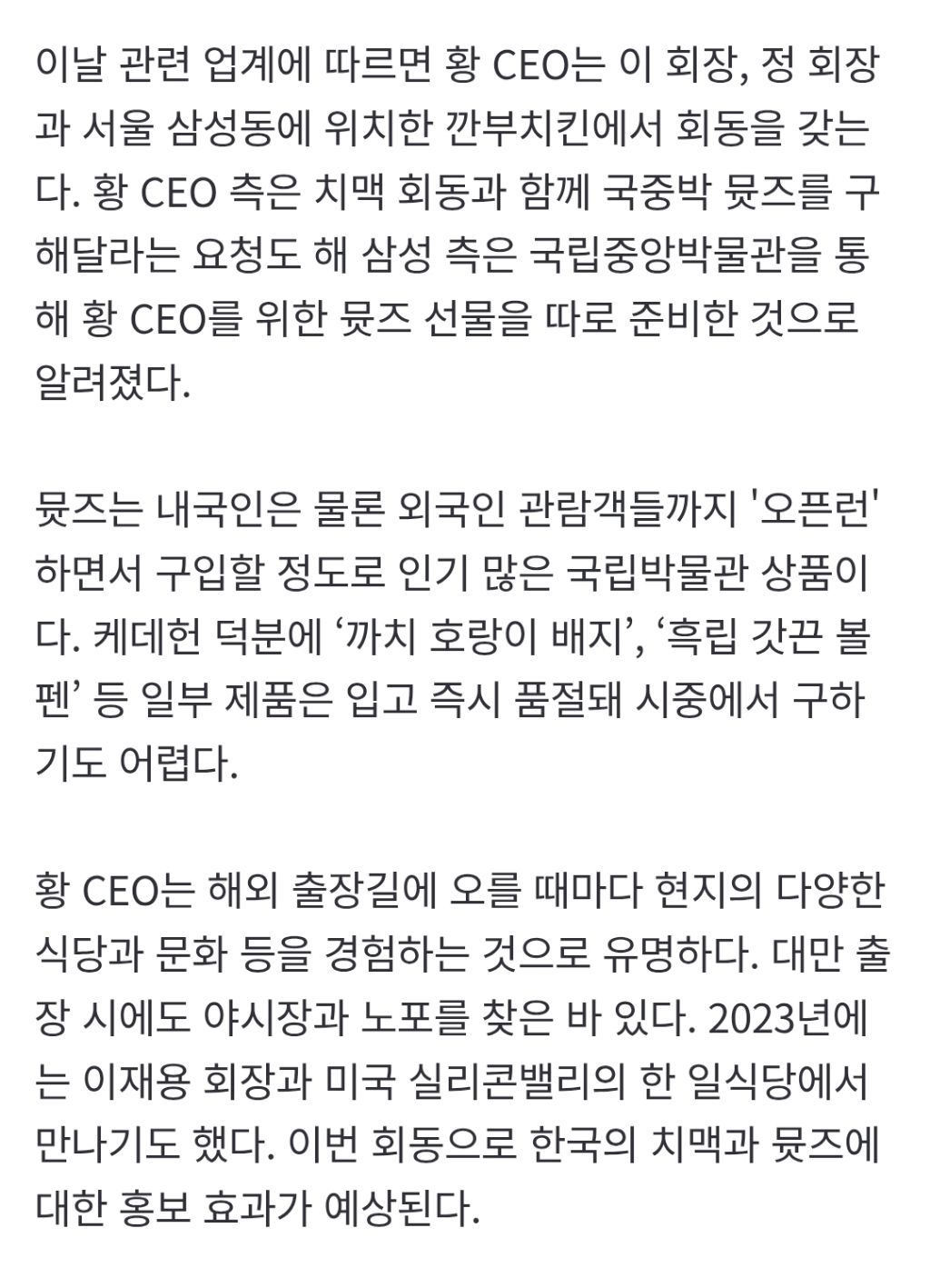 [기사][단독] 치맥회동 앞두고 삼성에 '국중박 굿즈' 부탁한 젠슨 황 작성자러바오|작성시간25.10.30|조회수20,304 목록 댓글 9 글자크기 작게가 글자크기 크게가 https://n.news.naver.com/article/015/0005204844[단독] 치맥회동 앞두고 삼성에 '국중박 굿즈' 부탁한 젠슨 황한국식 치맥(치킨+맥주)에 국립중앙박물관 뮷즈(박물관 기념품·뮤지엄과 굿즈를 합친 단어)까지…. 15년 만에 공식 방한한 젠슨 황 엔비디아 최고경영자(CEO)가 30일 이재용 삼성전자 회장, 정의n.news.naver.com 다음검색 현재 게시글 추가 기능 열기 북마크 공유하기 신고 센터로 신고 댓글 댓글 9 댓글쓰기 답글쓰기 댓글 리스트 답댓글 작성자금요일 | 작성시간 25.10.31 ㅋㅋㅋㅋㅋㅋㅋ 작성자한국외국어대학교 | 작성시간 25.10.30 굿즈 업체를 인수하는게 빠를 듯 작성자페르세우스 | 작성시간 25.10.30 아직 국중박 뮷즈를 알 정도인가 ㅋㅋㅋㅋㅋ 작성자Alexis Sanchez | 작성시간 25.10.30 ㅋㅋㅋㅋ 작성자동훈씨 나 알죠? 나 육천원 있어요 | 작성시간 25.10.30 혹시 케더헌 관련 상품인가ㅋ 댓글 전체보기