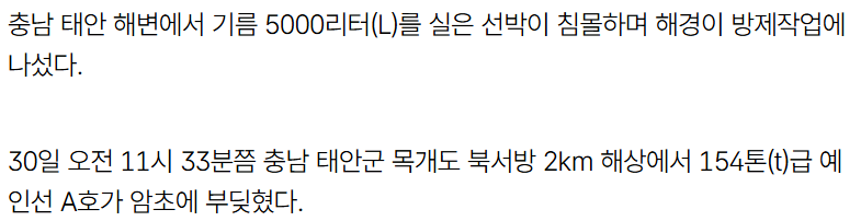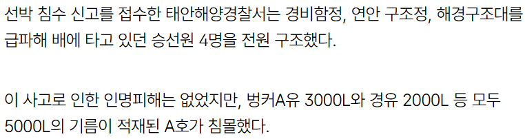 [기사][속보] 태안 해상 5000L 기름 실은 선박 침몰…“대책본부 꾸려 방제작업” 작성자인조인간 17호|작성시간25.10.31|조회수9,093 목록 댓글 13 글자크기 작게가 글자크기 크게가 참고로 2007년 땐 기름 유출이 1250만리터였음 [속보] 태안 해상 5000L 기름 실은 선박 침몰…“대책본부 꾸려 방제작업” | 디지털타임스 다음검색 현재 게시글 추가 기능 열기 북마크 공유하기 신고 센터로 신고 댓글 댓글 13 댓글쓰기 답글쓰기 댓글 리스트 작성자푸른쥐 | 작성시간 25.10.31 하~~~ 작성자I.B.I LUV | 작성시간 25.10.31 아니 하필 태안에서.. ㅜ.ㅜ 작성자Jesse Lingard | 작성시간 25.10.31 아니ㅡㅡ 하 답댓글 작성자Jesse Lingard | 작성시간 25.10.31 진짜 인재면 엄벌하자 작성자Wayne Rooney | 작성시간 25.10.31 양이 적긴 하네 댓글 전체보기