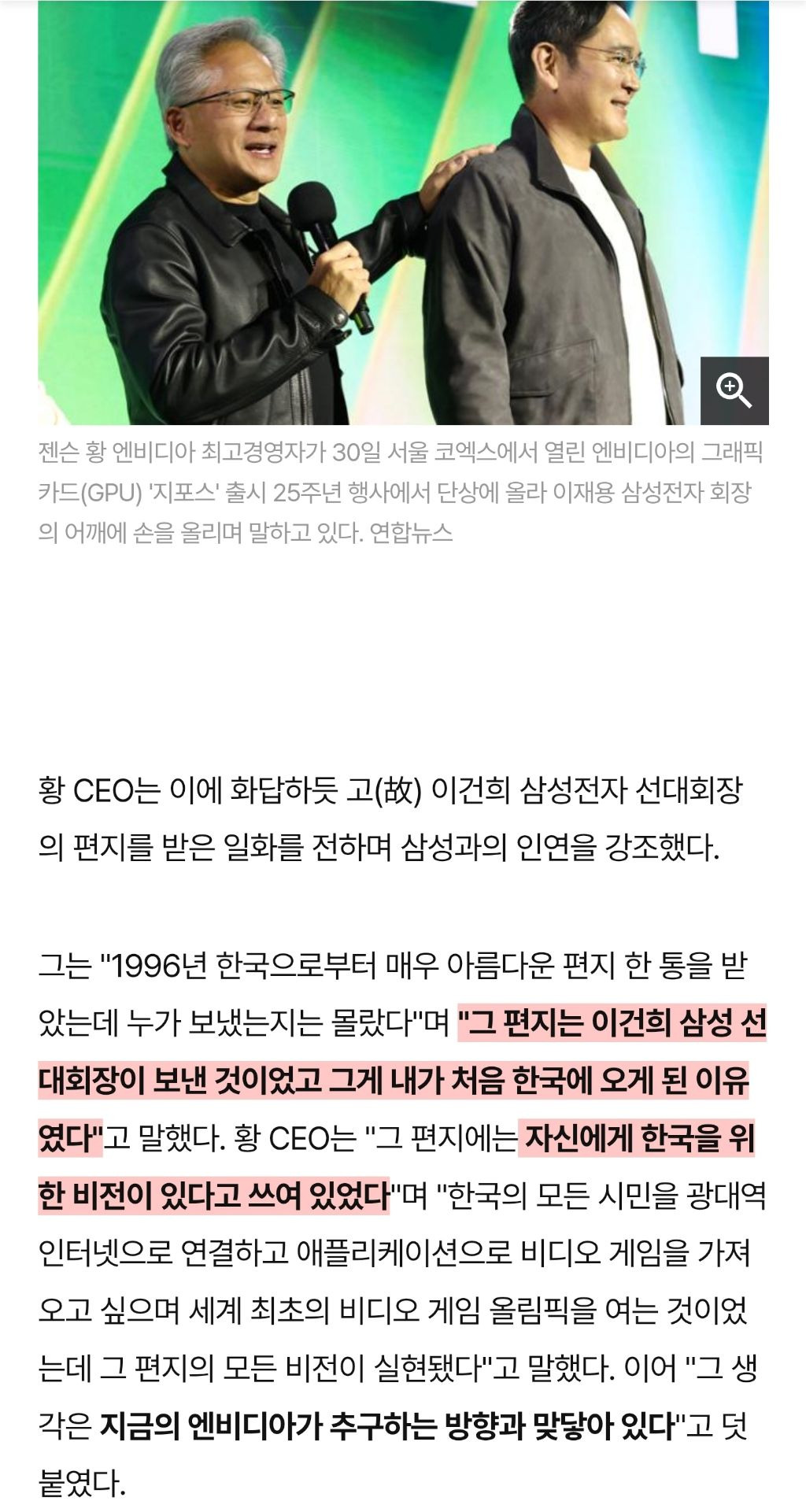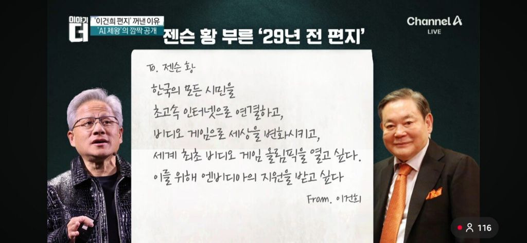 [기사]이건희가 29년전 젠슨 황에게 보낸 편지 작성자Solaris|작성시간25.10.31|조회수6,407 목록 댓글 16 글자크기 작게가 글자크기 크게가 다음검색 현재 게시글 추가 기능 열기 북마크 공유하기 신고 센터로 신고 댓글 댓글 16 댓글쓰기 답글쓰기 댓글 리스트 작성자아메리카노 | 작성시간 25.10.31 ㄷㄷ 작성자대한민국 축구 국가대표팀 | 작성시간 25.10.31 쩐다 작성자덤앤더머 | 작성시간 25.10.31 이건희는 진짜 회귀자였을지도 모름 답댓글 작성자살살합시다 | 작성시간 25.10.31 근데 왜..키스하다 ㅂ.. 작성자권은비의 영스트리트 | 작성시간 25.10.31 이건희 회장이 게임에도 관심이 많았죠 실제 게임기 출시도 했었고 e스포츠 투자도 많이핶죠 댓글 전체보기