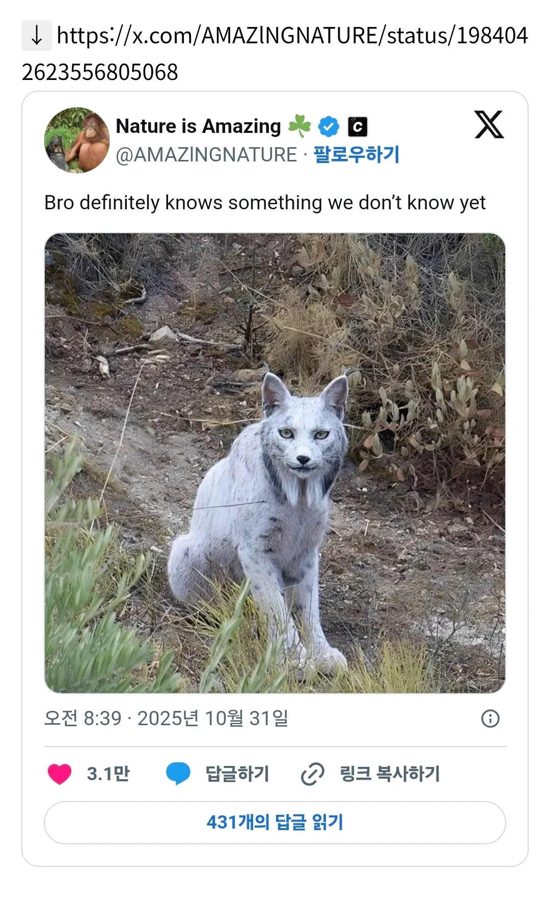 [동물]며칠 전 야생에서 발견된 하얀 이베리아스라소니 작성자ChatGPT|작성시간25.10.31|조회수6,647 목록 댓글 25 글자크기 작게가 글자크기 크게가 ㄷㄷㄷ 다음검색 현재 게시글 추가 기능 열기 북마크 공유하기 신고 센터로 신고 댓글 댓글 25 댓글쓰기 답글쓰기 댓글 리스트 작성자Levi Ackerman | 작성시간 25.10.31 전설의 포켓몬ㄷㄷ 작성자KTBFFH | 작성시간 25.10.31 우리나라 최대포식자가 딱 저정도면 좋겠음. 사람 해한적도 없다고 하니. 근데 밤에 산에 갔다가 보면 까무러칠듯ㅋㅋㅋ 작성자허니버터고구마 | 작성시간 25.11.01 영물느낌 ㄷㄷ 작성자오다기리 죠 | 작성시간 25.11.01 새치염색 좀 해야겠는걸 작성자찹쌀뜨억 | 작성시간 25.11.01 때껄룩 댓글 전체보기